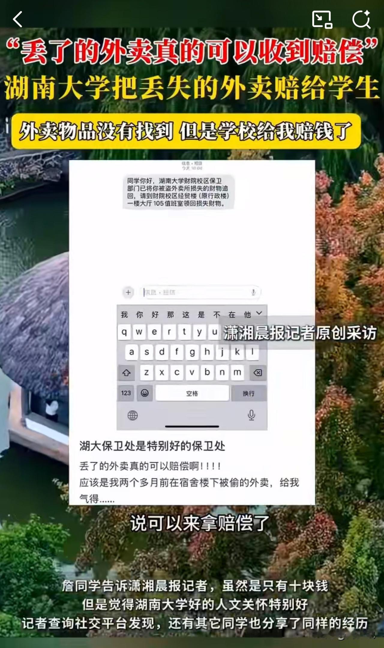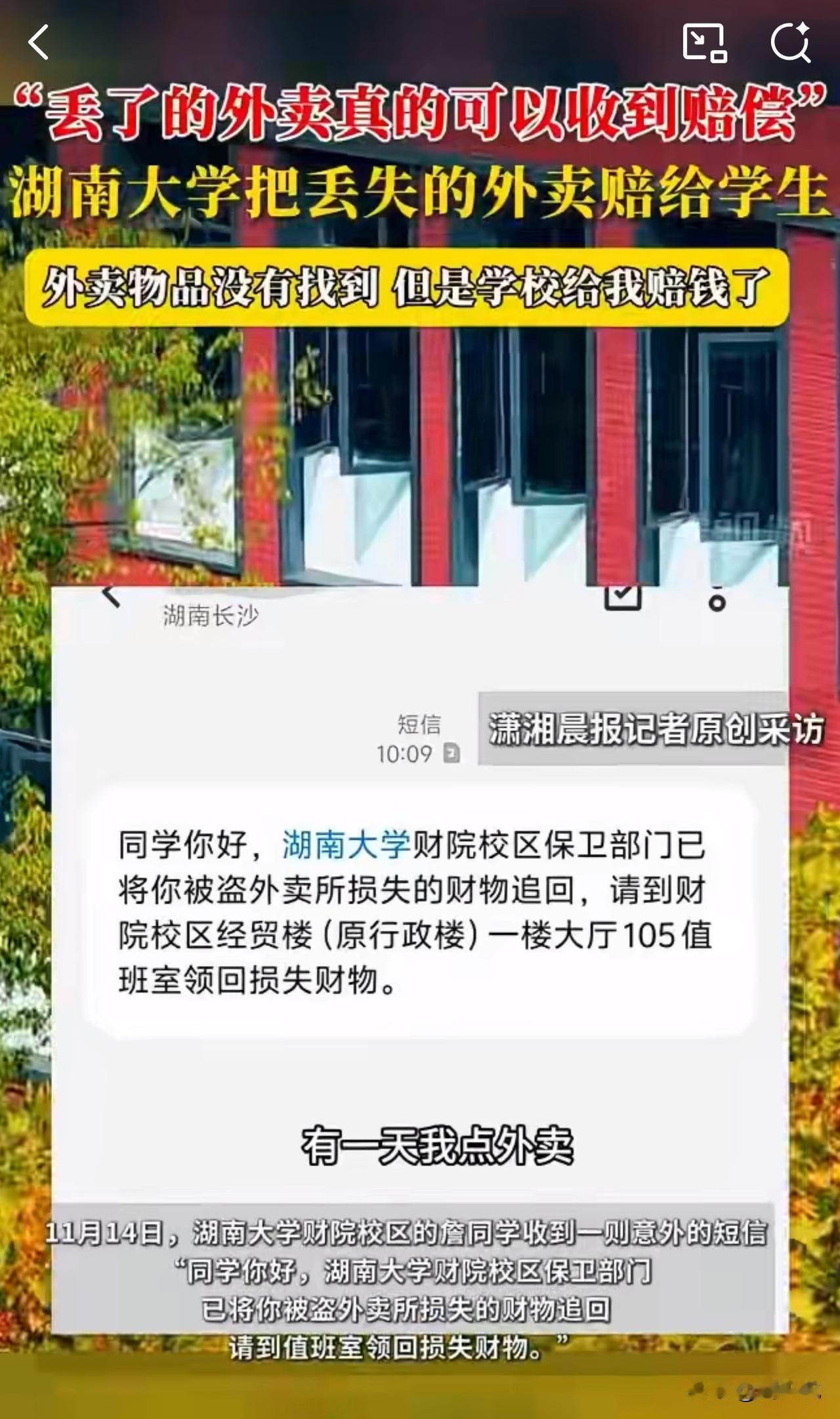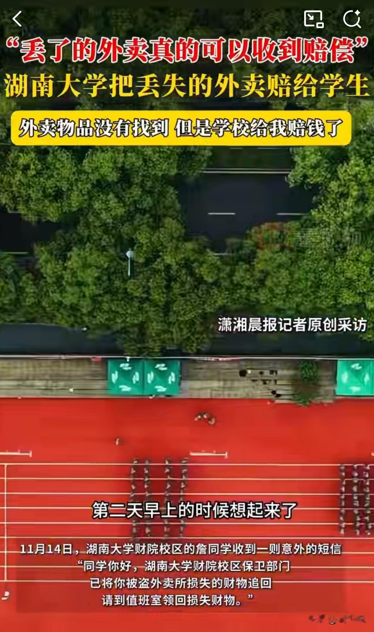 #MCN双量进阶计划#“丢了的外卖真能拿到赔偿!”湖南大学这波操作火了!近日,财院校区的詹同学收到一条意外短信,保卫科告知他一个月前丢失的外卖损失已追回,可前往领取全额赔偿。 原来詹同学此前点的10元饭盒被盗,查监控无果后,抱着试试看的心态去保卫科登记,没想到学校真的给了答复。他直言,钱不多,但感受到了满满的人文关怀,而社交平台上,不少湖大学生也分享了类似的赔偿经历。 此事引发网友纷纷点赞,称:“十块钱见格局,这样的学校太让人安心了”! 也有网友称:“对比有些学校扔外卖的操作,湖大这波太圈粉”! 还有网友坦言:“把学生的小事放在心上,才是好大学该有的样子”。 周少想说校园外卖丢失看似是小事,却关乎学生的切身感受。湖大没有忽视这份“小委屈”,用真金白银的赔偿传递温度,这份重视与担当,比任何口号都更有力量。 更重要的是,这份不忽视小事的人文关怀,不仅化解了学生的困扰,更彰显了高校的责任与温度,值得更多院校学习。于细微处见真情,才能让学生真正感受到归属感。 对于湖南大学赔钱给丢外卖的学生,大家有被暖到么?#寻美三湘# #长沙新朋友#