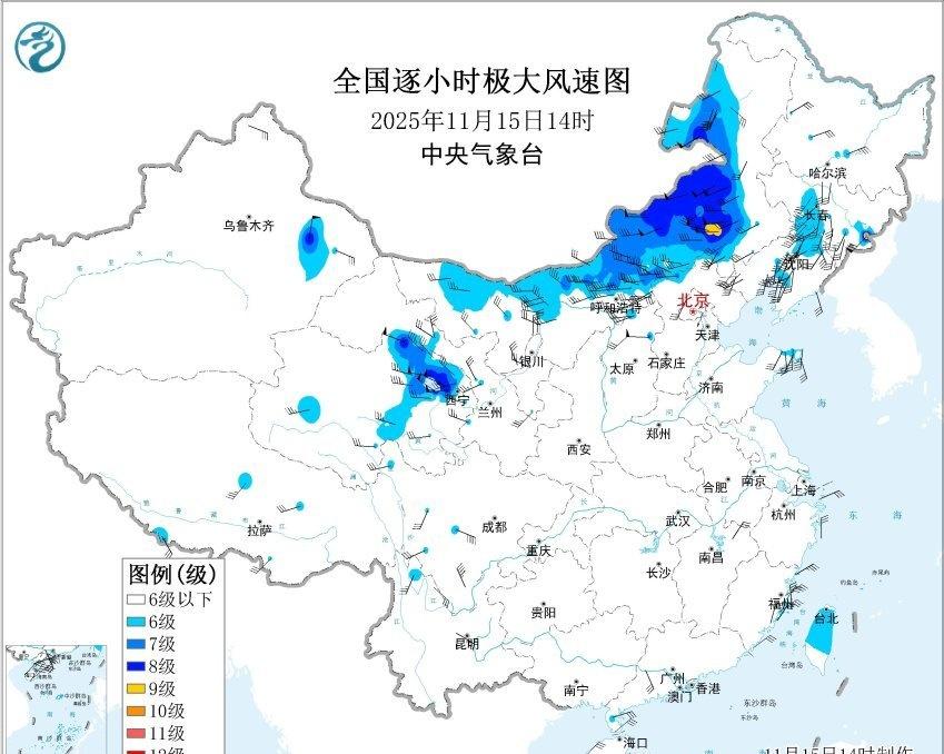 今天寒潮的主体还在蒙古国。今天白天内蒙古部分地区处于冷锋后部,开始降温。在冷锋附近,还出现了大风天气。锡林郭勒盟和赤峰市部分站点,阵风达到了8-9级。明后两天寒潮将快速南下,导致中东部出现大范围的大风降温。