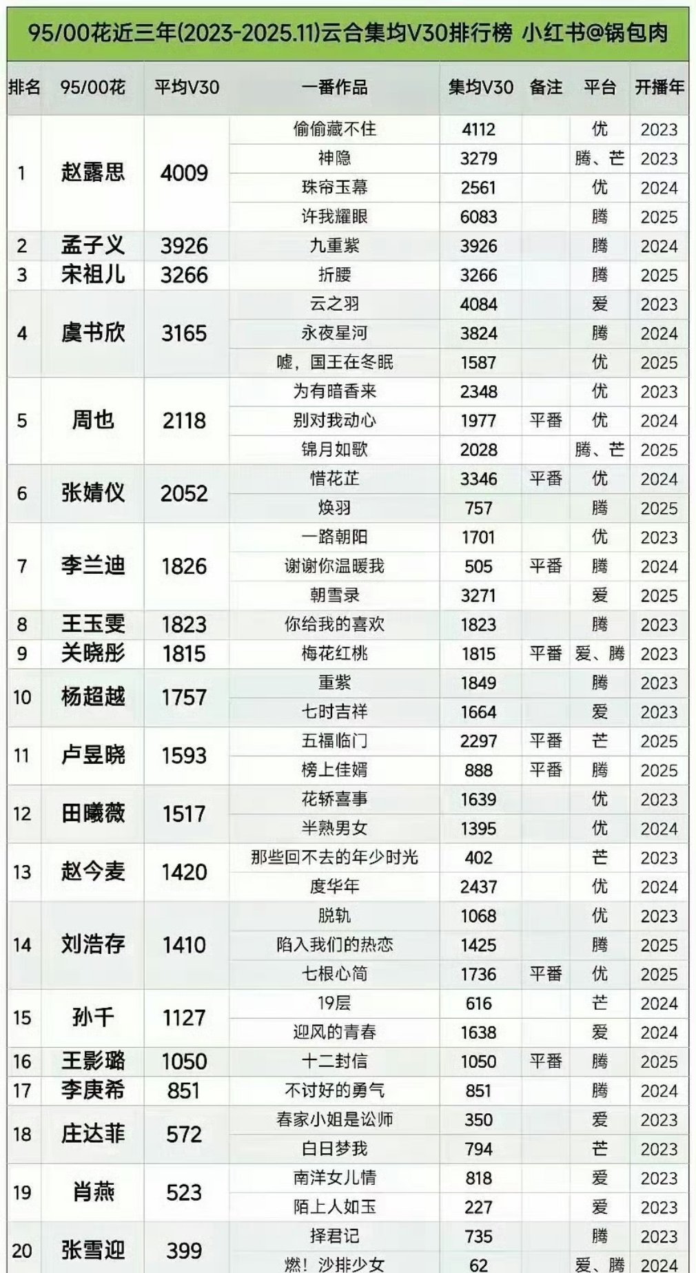 95/00花近三年一番剧云合情况,赵露思951没毛病吧