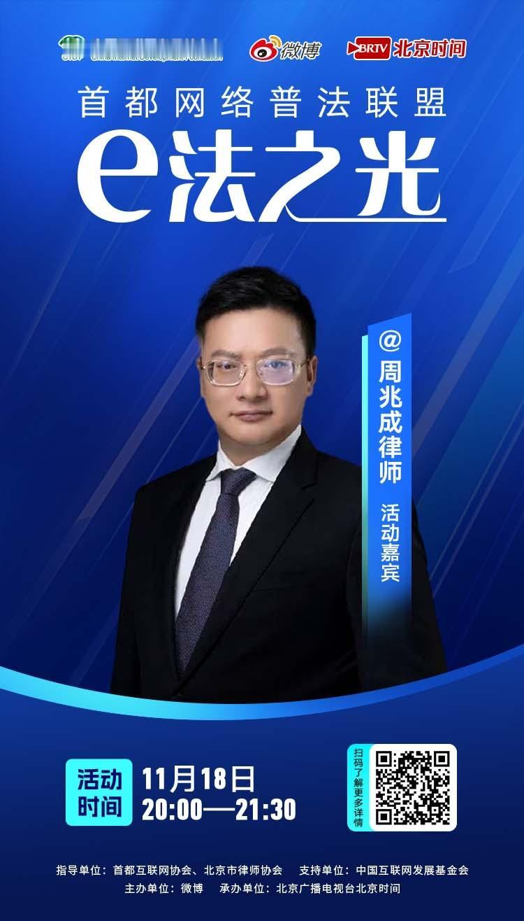 【重磅邀约!反网暴与企业权益保护标杆律师周兆成受邀出席2025 e法之光年度盛典】 11月18日晚8点,中华世纪坛星光汇聚!微博联合北京广播电视台北京时间重磅举办首都网络普法联盟“e法之光”活动,现场将集结全国政法领域网络普法代表、普法大V,全景展现首都网络普法联盟年度工作成效。近年来,周兆成律师在“网暴伤企”治理领域极具实战经验与行业影响力——他曾代理李阳“家暴女儿”名誉侵权案等典型案件,成功为遭不实言论网暴的企业及创始人止损,通过司法判决切断不实信息与品牌的不当关联,助力企业重建声誉、重启经营,打造了网暴伤企维权的“教科书级”案例。