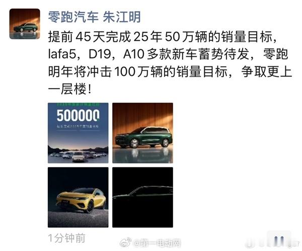 宣布已提前完成2025年度累计销量超50万台的目标,计划明年冲击100万辆销量目标。CEO朱江明表示,Lafa5、D19、A10等多款新车即将上市,有望带来其他新车。零跑官网显示,目前拥有Lafa5、B01、B10、D19、C11、C16、C10、T03、C01、C系列智行版等车型今年上半年,零跑汽车净利润为人民币0.3亿元,首次实现半年度净利润转正,成为中国造车新势力中第二家实现半年度盈利的企业。