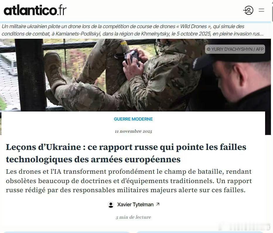 西媒Atlantico发布了一份对俄罗斯非公开分析报告的解读, 该报告阐述了2022年后战争形态的演变及欧洲军队未能适应新现实的原因。无人机、人工智能、传感器与不间断的数字化侦察已彻底改写作战规则,致使半数以上的西方军事理念趋于过时,当今战场已近乎完全透明, 任何兵力集结都会遭即时摧毁, 坦克失去过去的实战价值, 炮兵部队多数时间也需保持隐蔽状态。目前,无人机已承担70%的杀伤任务, 预计到2026年将出现由单名操作员或人工智能控制的蜂群系统,在此环境下,传统军事力量的装甲车、大规模攻势、补给纵队等均已沦为自杀式无人机理想的打击目标。与北约国家不同,俄罗斯已成功完成新型战争的产业转型:实现竞技无人机(指自杀式无人机)、电子战系统、网络回传系统及自主作战体系大规模自主量产,西方要达到这个目标则需从根本上重构自身的产业与战术体系。对比实战经验得出的最终结论,优势必然属于掌握数字技术且具备无人机与反制系统工业级量产能力的一方,欧洲军队在此领域的落后程度已触及危机红线。