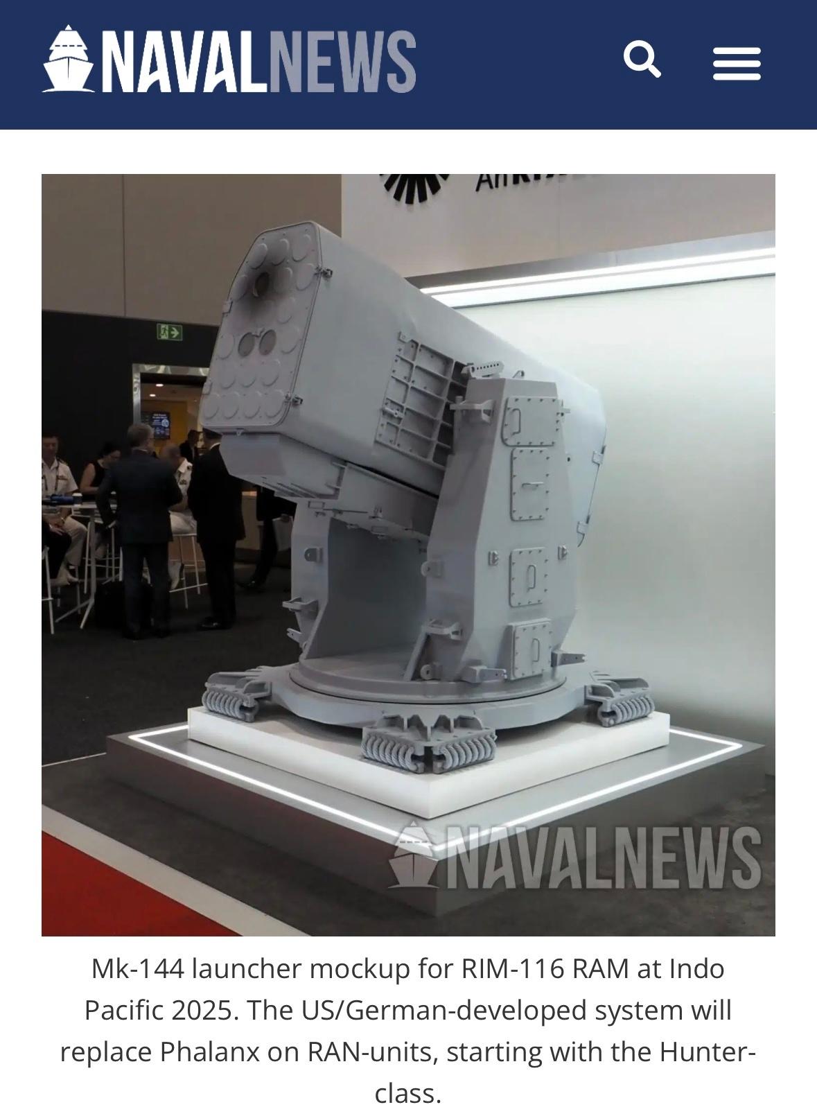 中外舰闻超话 烽火问鼎计划 根据Naval News在Indo Pacific 2025的报道,澳大利亚🇦🇺皇家海军正在用Mk-144发射器和RIM-116 “拉姆”(RAM)导弹做为“标准近防武器系统”,取代目前在水面战舰上使用的“密集阵”近防武器系统。 而第一款装备Mk-144发射器和RIM-116 “拉姆”(RAM)导弹的战舰是“亨特”(Hunter)级导弹护卫舰(所以所谓“新模型”上的配置还是和实际配置不符) 评论:推测大概率加拿大🇨🇦皇家海军的“河流”级导弹驱逐舰也是同样的配置?