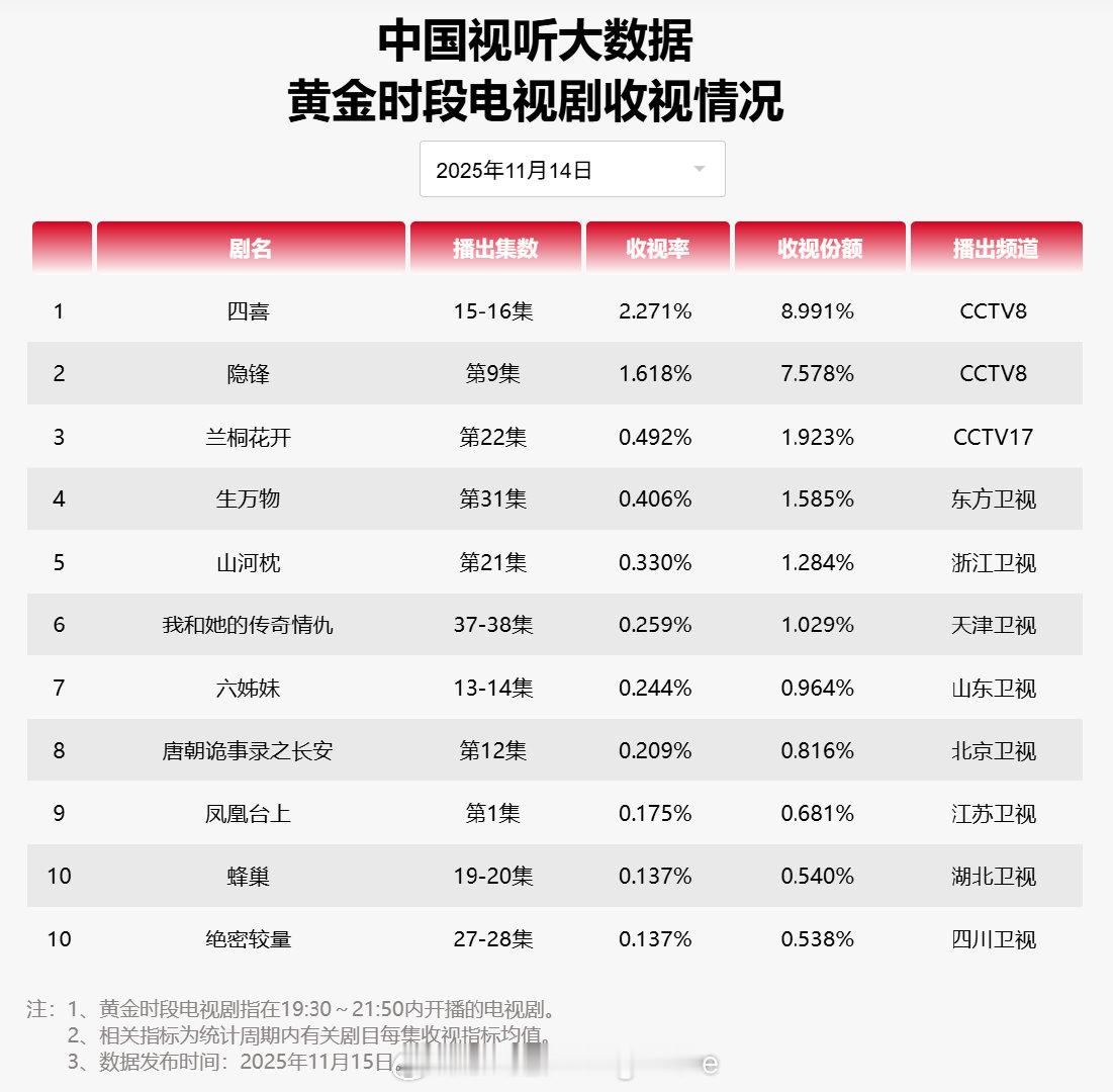 【2025年11月14日中国视听大数据CVB黄金档电视剧收视率日榜TOP10】1 四喜 CCTV82 隐锋 CCTV83 兰桐花开 CCTV174 生万物 东方卫视5 山河枕 浙江卫视6 我和她的传奇情仇 天津卫视7 六姊妹 山东卫视8 唐朝诡事录之长安 北京卫视9 凤凰台上 江苏卫视10 蜂巢 湖北卫视10 绝密较量 四川卫视