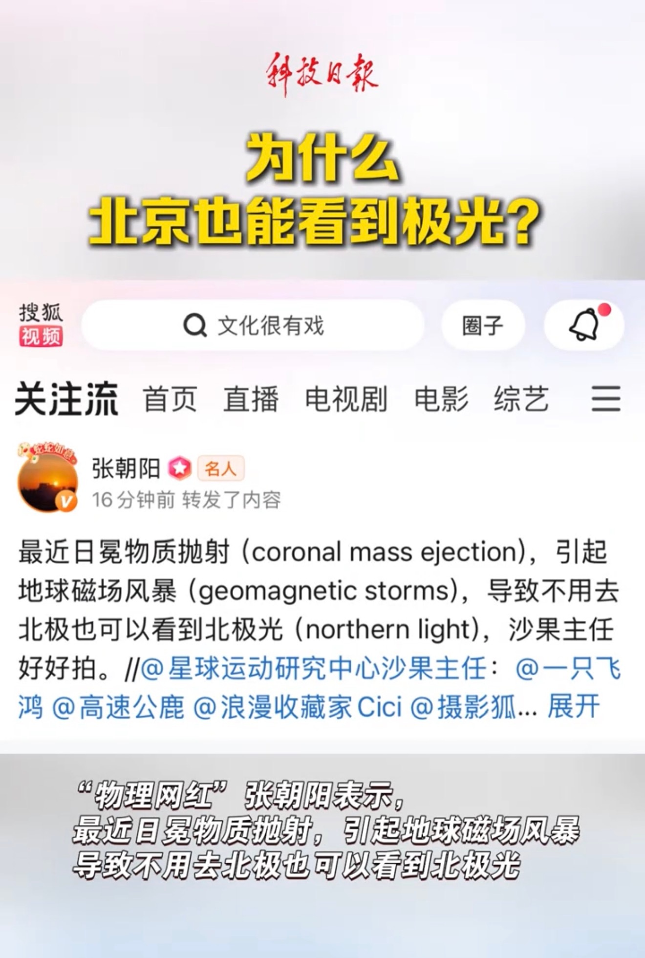 昨天北京极光冲上热搜,很多网友也在晒图,确实很好看,原来不用去北极也能看到极光。其实,极光虽然叫极光,但确实不是非要到北极才能看,北欧、加拿大等地也是很棒的观看极光的胜地。极光本质上是太阳风带电粒子沿地球磁力线偏转至两极,撞击高层大气原子/分子,后者退激发过程的发光现象,不过北京能看到极光确实很罕见。搜狐创始人张朝阳博士在搜狐视频关注流给出了解释,因为最近日冕物质抛射,引起地球磁场风暴,才让北京人也能大饱眼福。