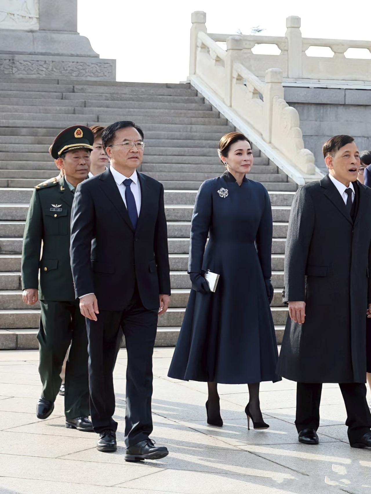 11月15日,苏提达王后向人民英雄纪念碑敬献花圈! 值得一提的是,这次苏提达王后的造型非常端庄大气,尤其是苏提达王后戴着的一对蓝色宝石耳坠非常抢镜,和她穿的深蓝色衣服也超级搭配,再加上她白皙的皮肤,还有优雅的身姿,站在那里笔挺的身材王后范太足了。 除此之外,苏提达王后还戴一副黑色手套,手里好像拿着两本书的东西。当然了玛哈国王穿的也是深色大衣。两人越看越有夫妻相。 据悉这也是苏提打王后来北京第三天了,他们要在北京停留五天时间,当然了他们的到来,也引起国际媒体的关注,毕竟这也是玛哈当上国王后首次来北京访问,意义非常重大。