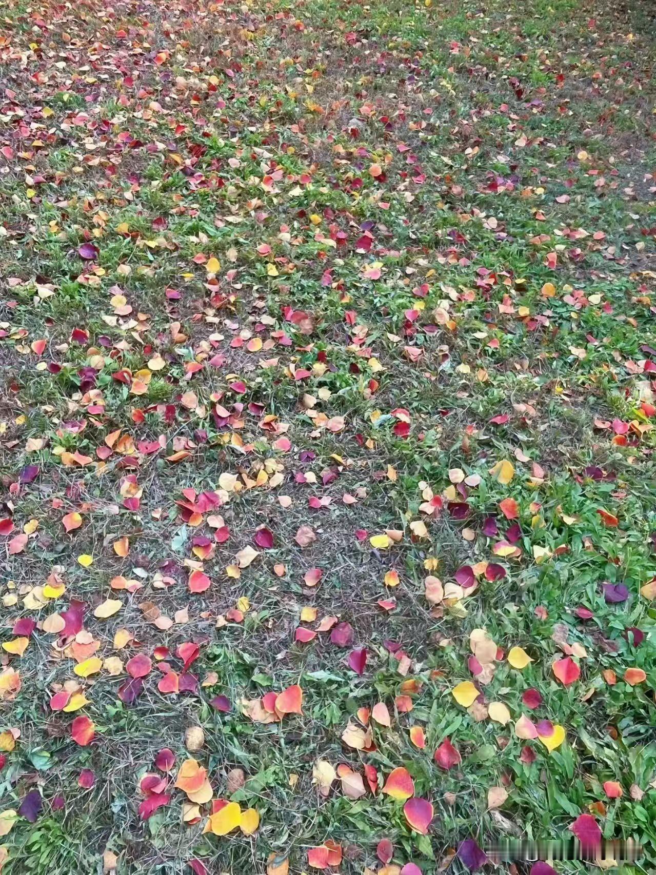 你看这草地,跟撒了盘颜料似的——红的黄的紫的叶子混着没枯透的绿,踩上去肯定“咯吱