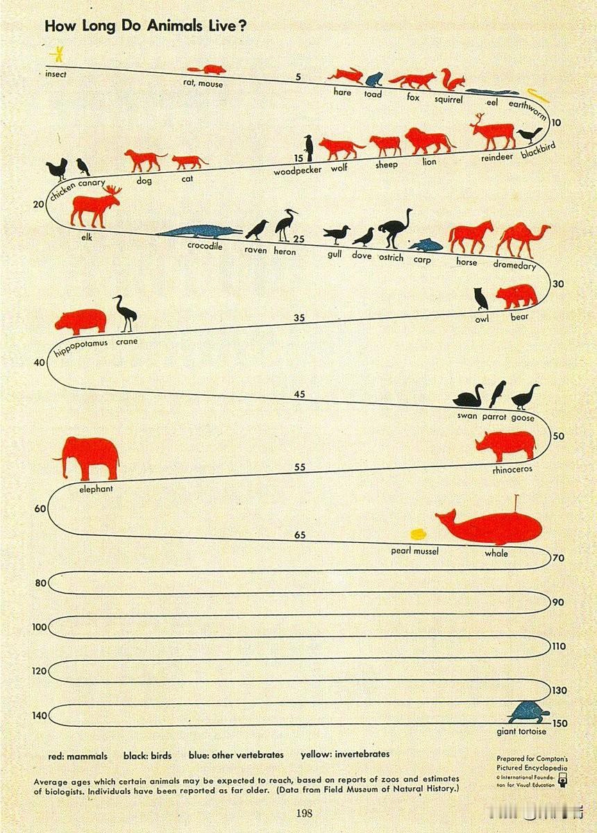 《动物寿命有多长?》出自1943年出版的《康普顿图解百科全书》,描绘了哺乳动物、鸟类、其他脊椎动物和无脊椎动物的预期寿命。锯齿状的线条设计巧妙地将冗长的时间线浓缩成简洁的信息图。 该图表最初由格尔德·阿恩茨(Gerd Arntz)为1939年或1943年版的《康普顿百科全书》绘制,采用了一种名为 ISOTYPE(国际图形教育系统)的早期信息图表技术。 图表使用弯曲的时间线(最长可达150年)和颜色编码来区分不同类群的动物: 红色: 哺乳动物 黑色: 鸟类 蓝色: 其他脊椎动物 黄色: 无脊椎动物