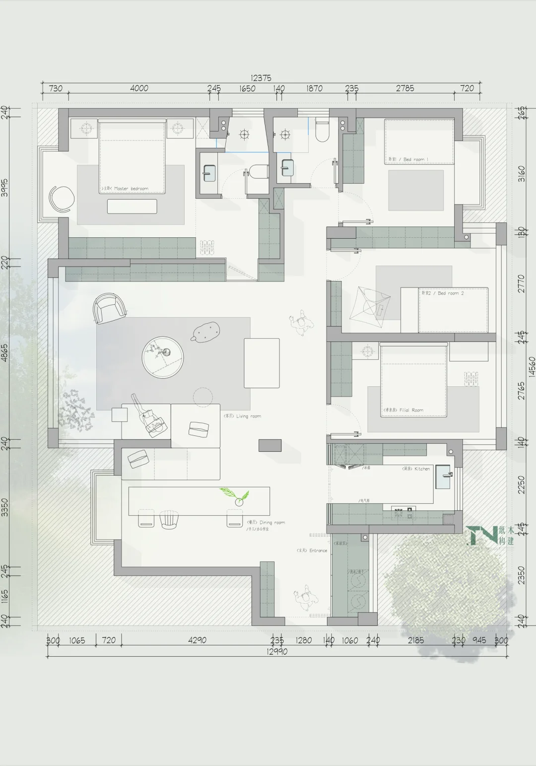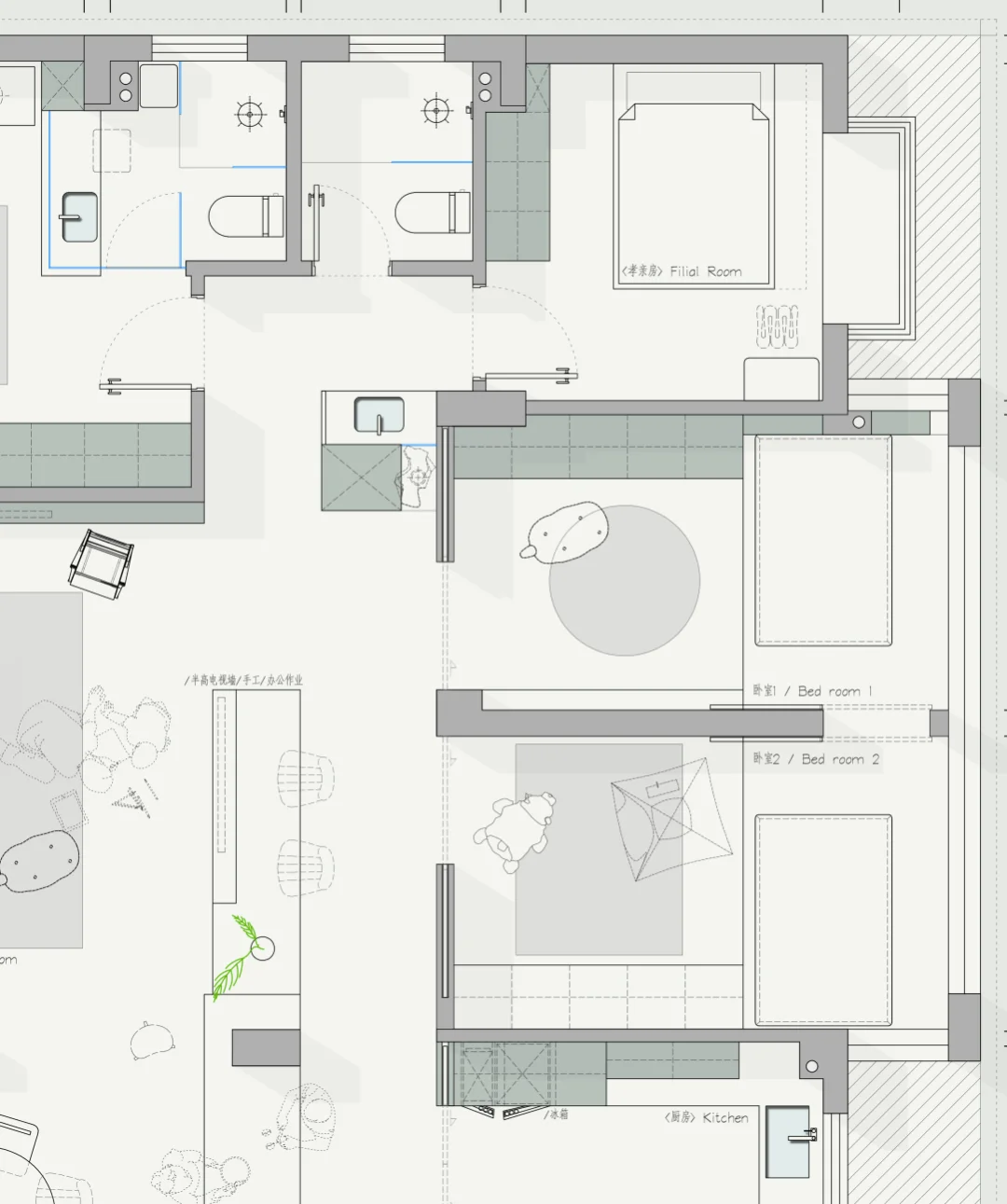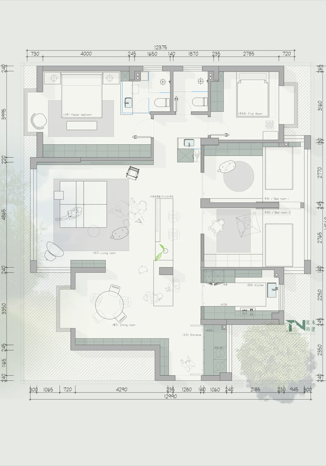设计需求: 一家四口👨👩👧👦 1、主卧要大大衣柜 2、两个儿童房,最好差不多大 3、客房(爷爷奶奶偶尔来住) 4、客餐厅有趣点的 5、家政间