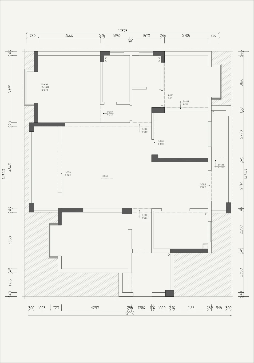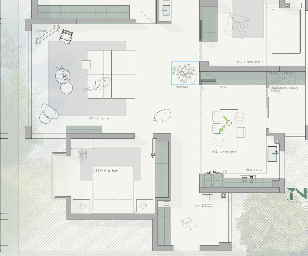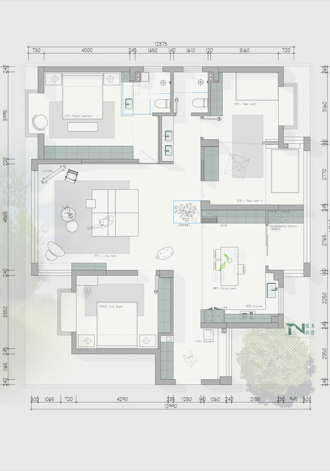 设计需求: 一家四口👨👩👧👦 1、主卧要大大衣柜 2、两个儿童房,最好差不多大 3、客房(爷爷奶奶偶尔来住) 4、客餐厅有趣点的 5、家政间