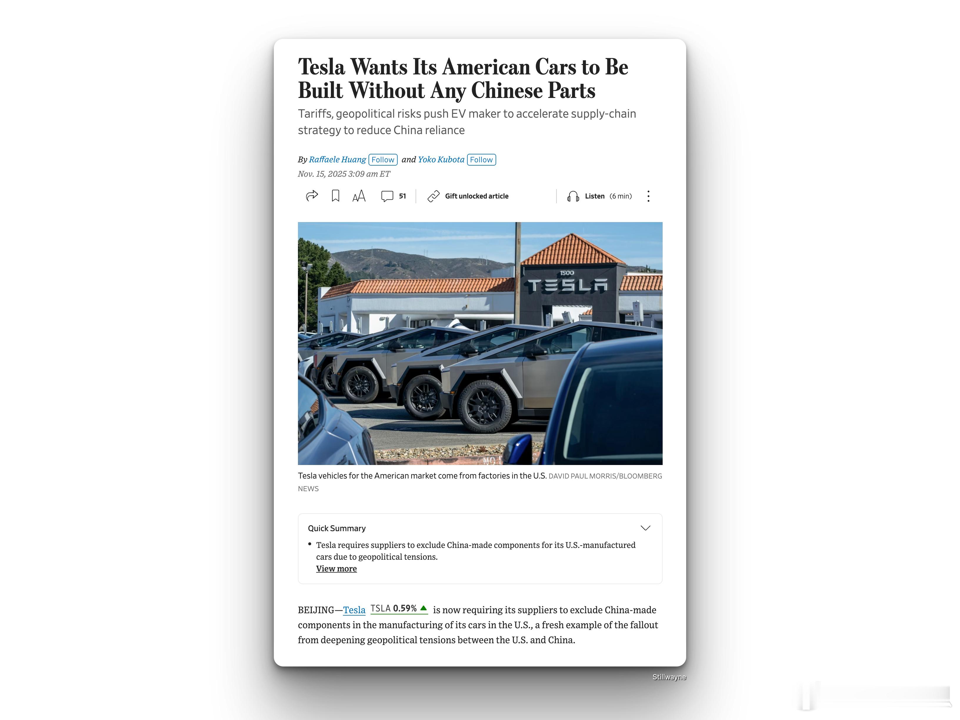 特斯拉要求在美国生产的特斯拉汽车上避免使用中国产零部件据知情人士透露,今年早些时候,特斯拉决定停止使用中国供应商为美国生产的特斯拉汽车提供零部件。特斯拉及其供应商已经用其他地区生产的零部件替换了部分中国制造的零部件。一些知情人士表示,特斯拉的目标是在未来一两年内实现美国生产的汽车完全不含中国制造零部件。特斯拉在中国的供应商越来越多地向其位于世界各地的工厂供应零部件。一位常驻中国的特斯拉高管今年早些时候表示,上海工厂拥有约400家直接的中国供应商,其中超过60家为特斯拉的全球生产提供零部件。美国是特斯拉最大的市场,美国道路上的特斯拉汽车均产自特斯拉位于美国的工厂。在中国,特斯拉在上海工厂生产汽车,主要使用本地生产的零部件。上海工厂生产的汽车也销往中国国内以及海外,主要是亚洲和欧洲,但不包括美国。