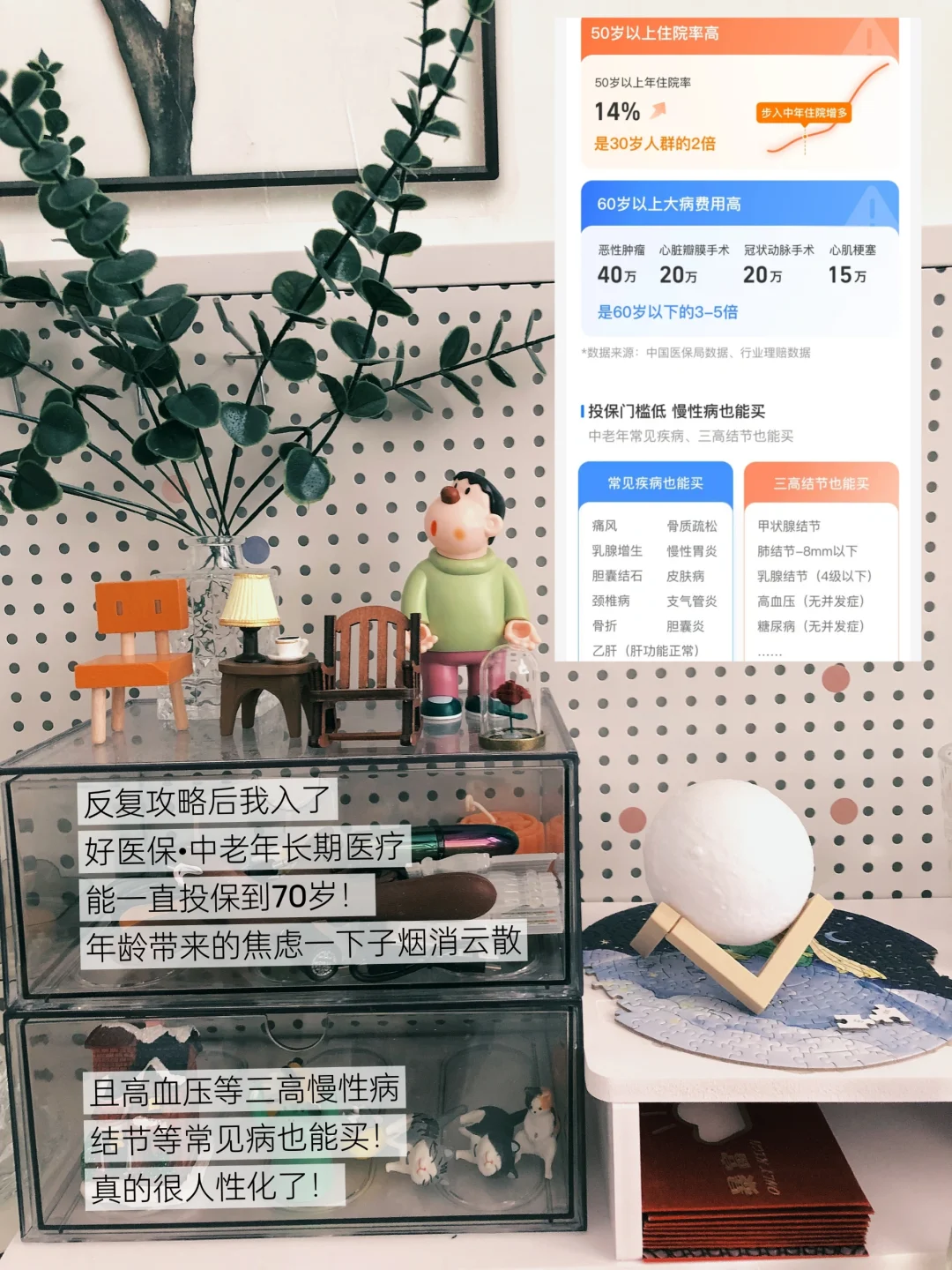 √我爸妈都60多了,之前的保险要么直接拒保,要么限制一大堆。但好医保·中老年长期医疗,能一直投保到70岁[赞R]年龄带来的焦虑一下烟消云散。且高血压等三高慢性病、结节等常见病也能买,很人性化了
