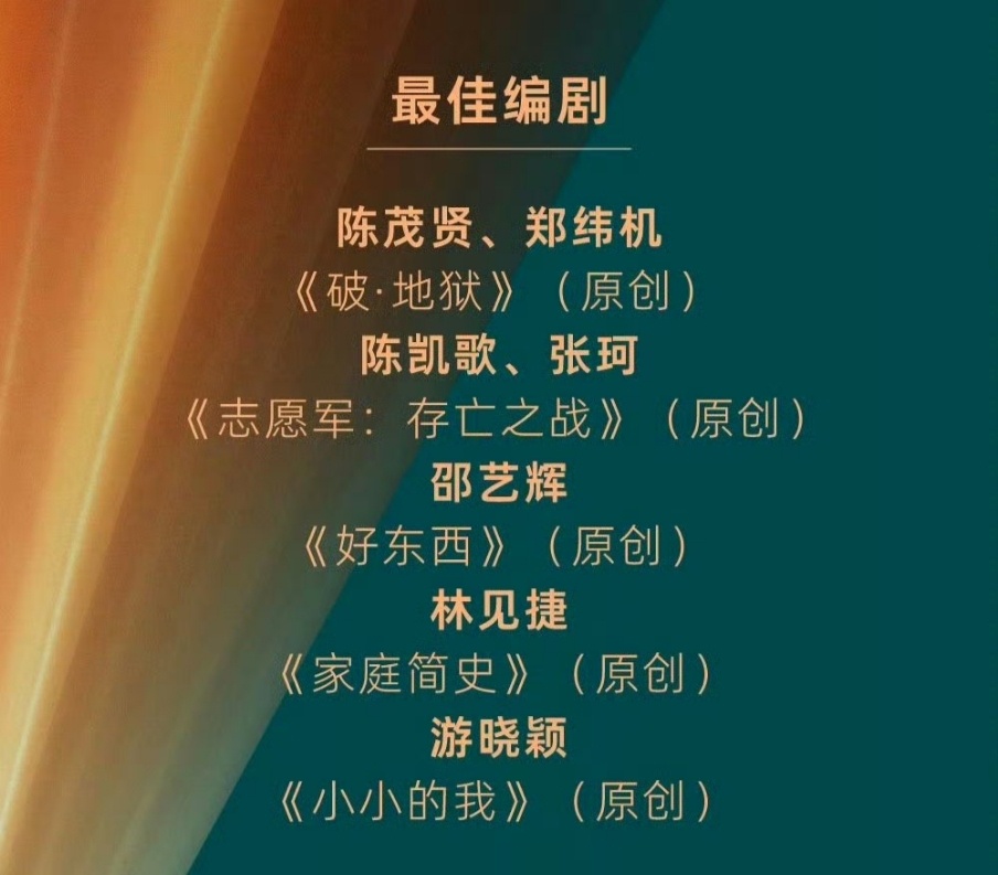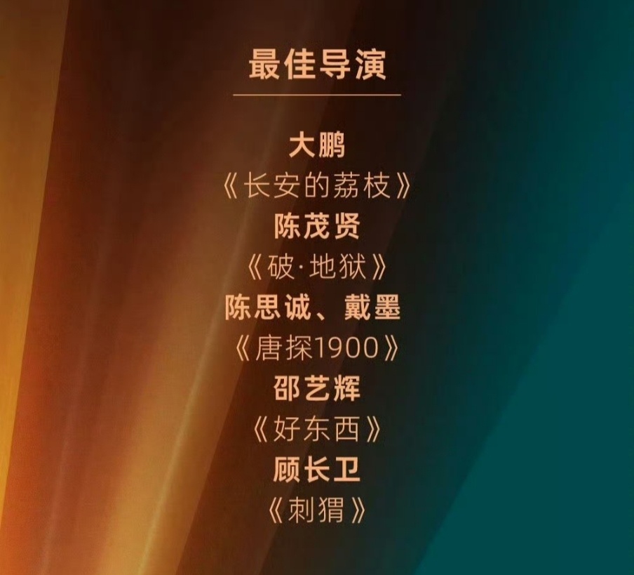 金鸡奖最佳编剧:陈茂贤/郑纬机(《破·地狱》)金鸡奖最佳导演:陈思诚/戴墨(《唐探1900》)