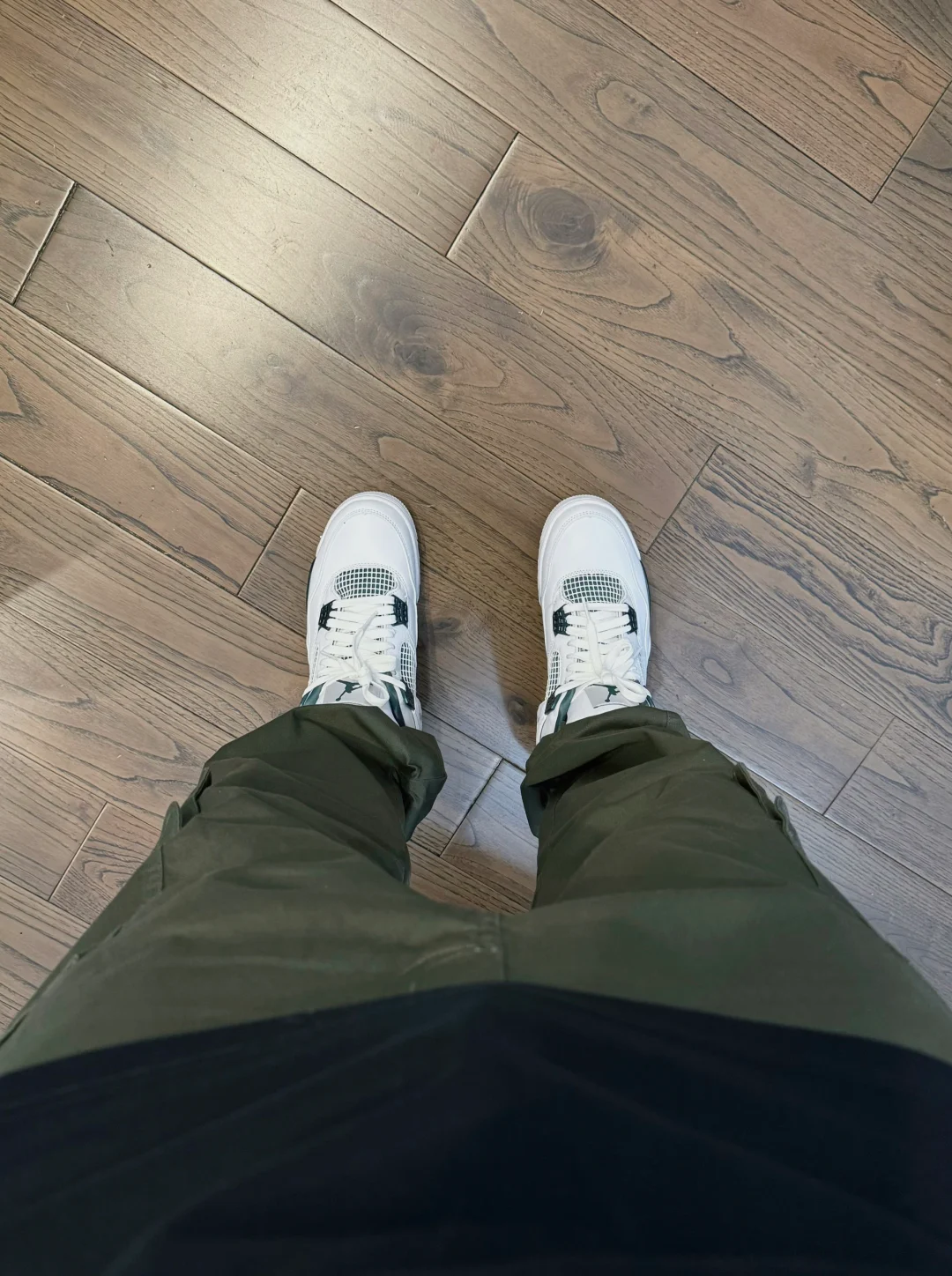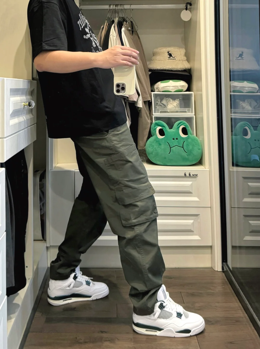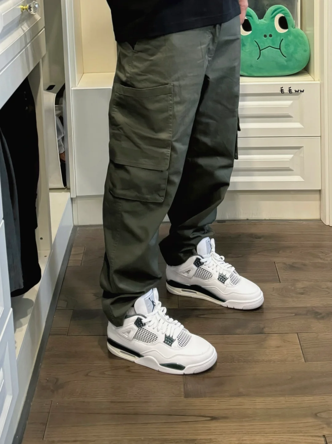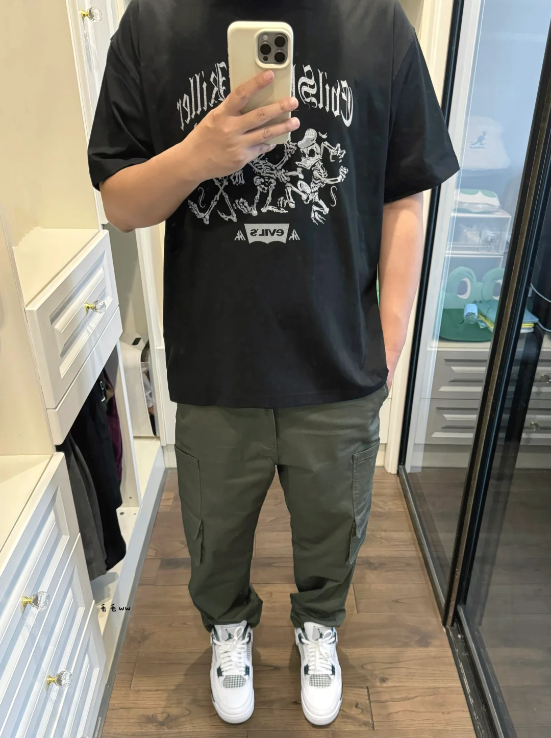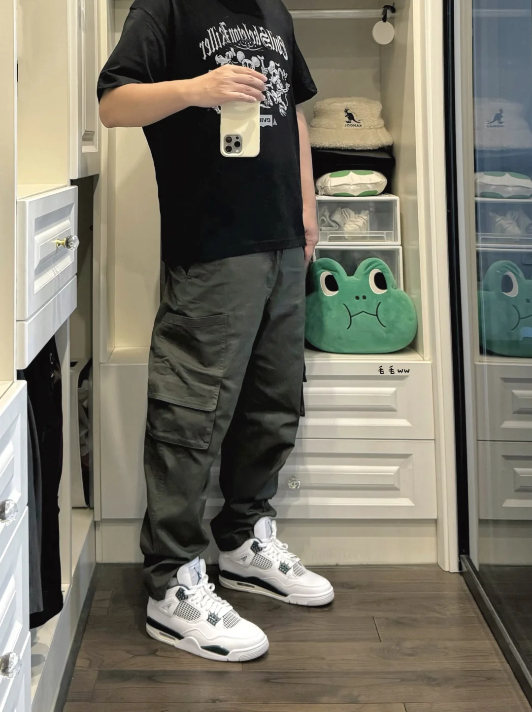 -乔四跟工装裤,简直不要太搭,鞋型足够立体让裤脚跟裤腿都能支棱起来;黑白绿的配色方案,运用军绿色系,工装风拉满 . —————— . 👕Hyperkiller // L . 👖Teenie Weenie Men // XL . 👟Air Jordan 4 / oxidized green // 42.5 . —————— . ✏️本人178cm75kg 球鞋尺码265mm(正常EU42) . 💭以上均为我个人观点,不喜勿喷,欢迎讨论。