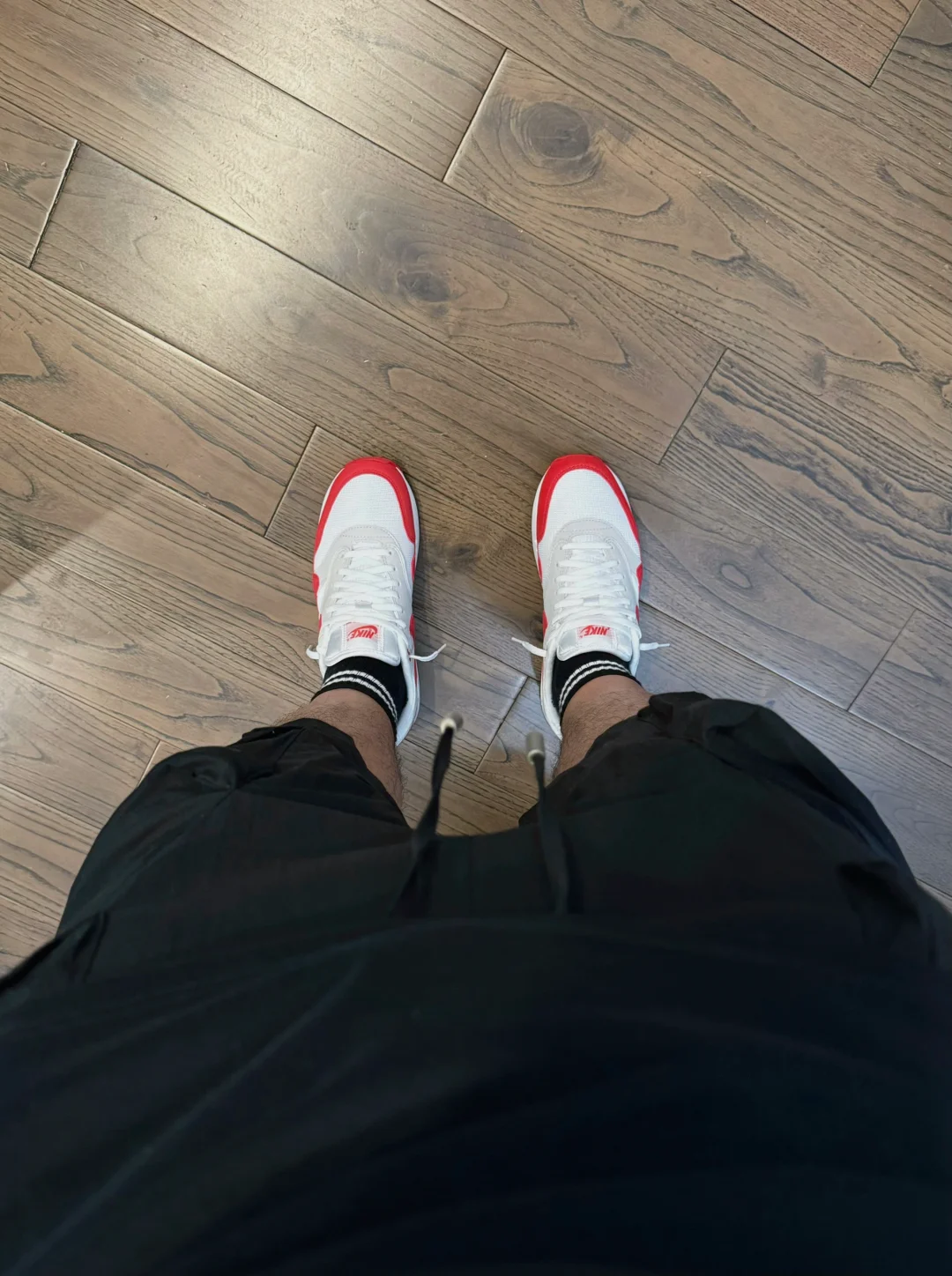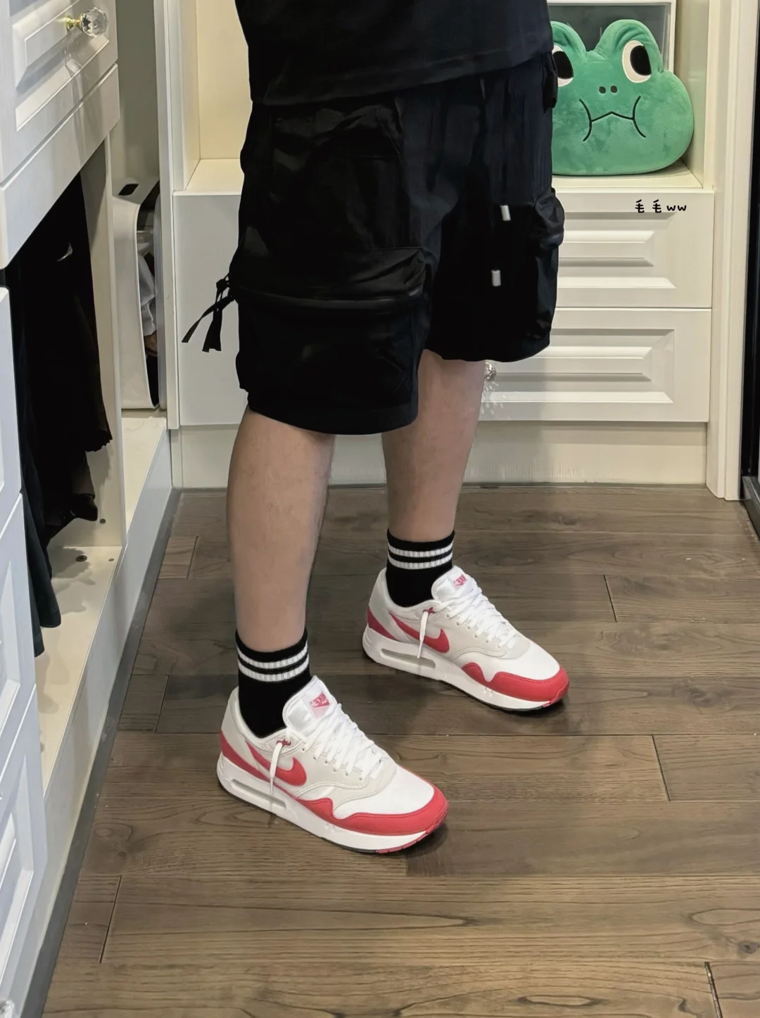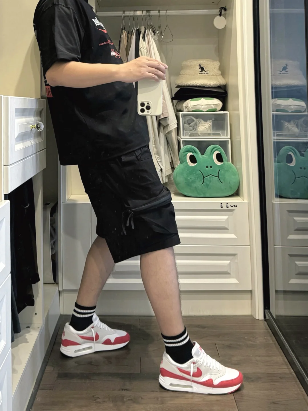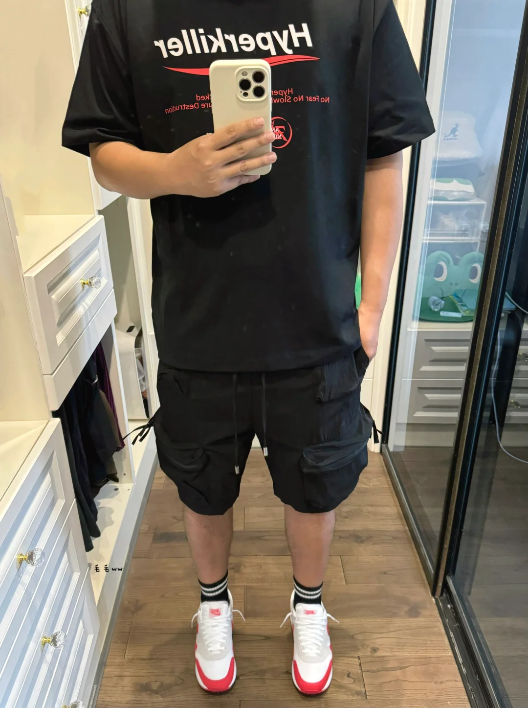 -全套黑色look,红色细节与复古跑鞋呼应;工装短裤,材质很多样,选了一条偏透气属性的尼龙 . —————— . 👕Hyperkiller // L . 🩳Profound // XL . 👟Air Max 1 '86 // 42 . —————— . ✏️本人178cm75kg 球鞋尺码265mm(正常EU42) . 💭以上均为我个人观点,不喜勿喷,欢迎讨论。