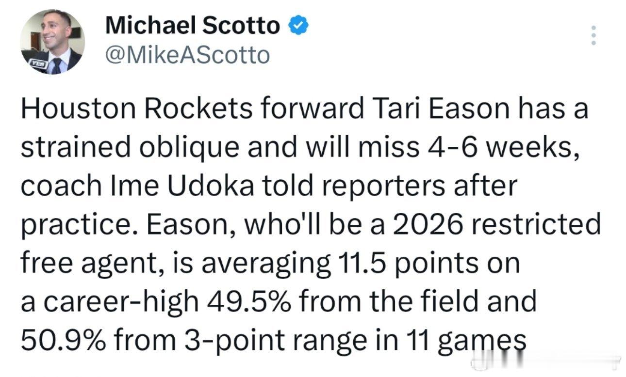 伊森腹斜肌拉伤,将缺席4-6周。本赛季,伊森场均11.5分5.2板1.6助,命中率49.5%,其中三分场均出手4.8次,命中率50.9%,生涯新高。