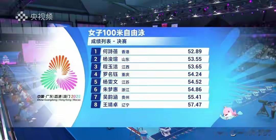 第十五届全运会女子100米自由泳决赛,香港队何诗蓓以52秒89夺冠,领先第二名杨浚瑄0.66秒,这是她继200自夺冠后,又拿到的本届赛事第二金。