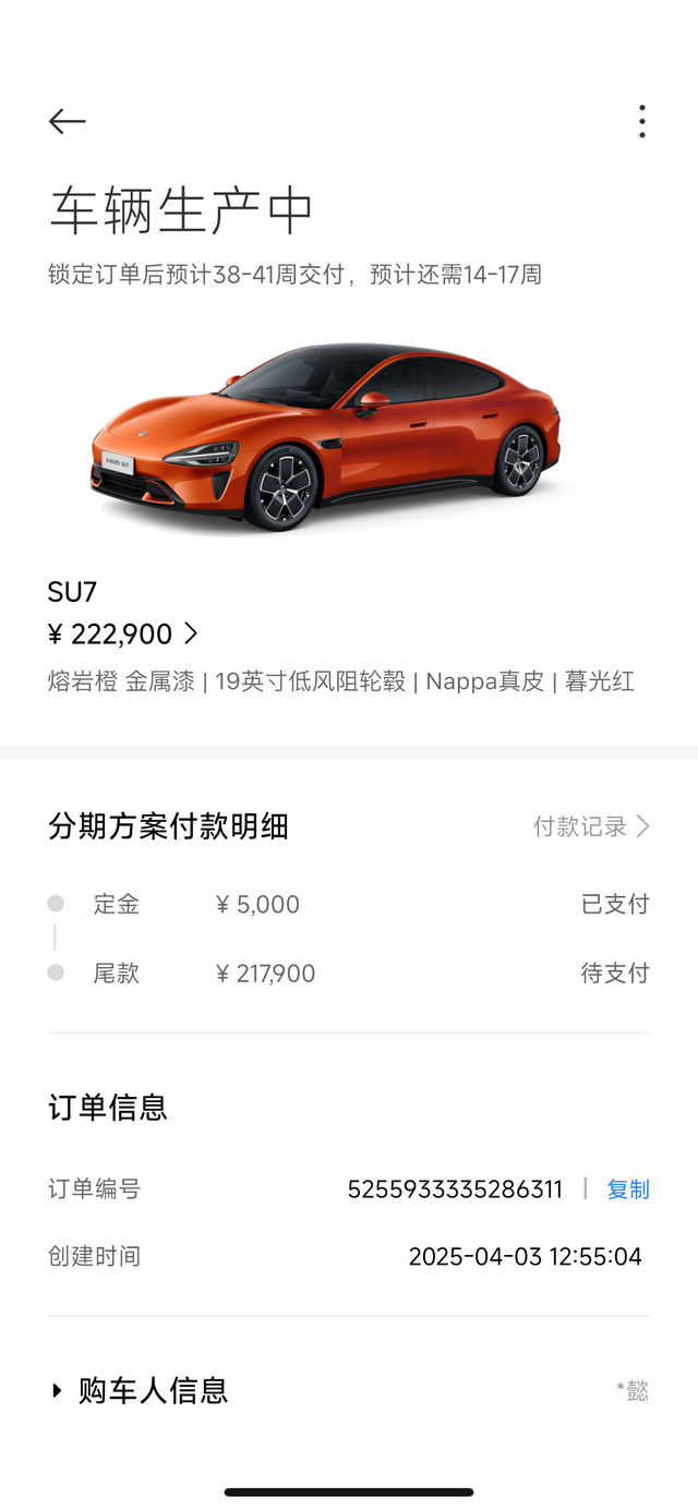转一个小米su7熔岩橙 绝版了。。 很好看的颜色 着急用车还是打算换别的车了,车子橙外红内,配置都在图上了