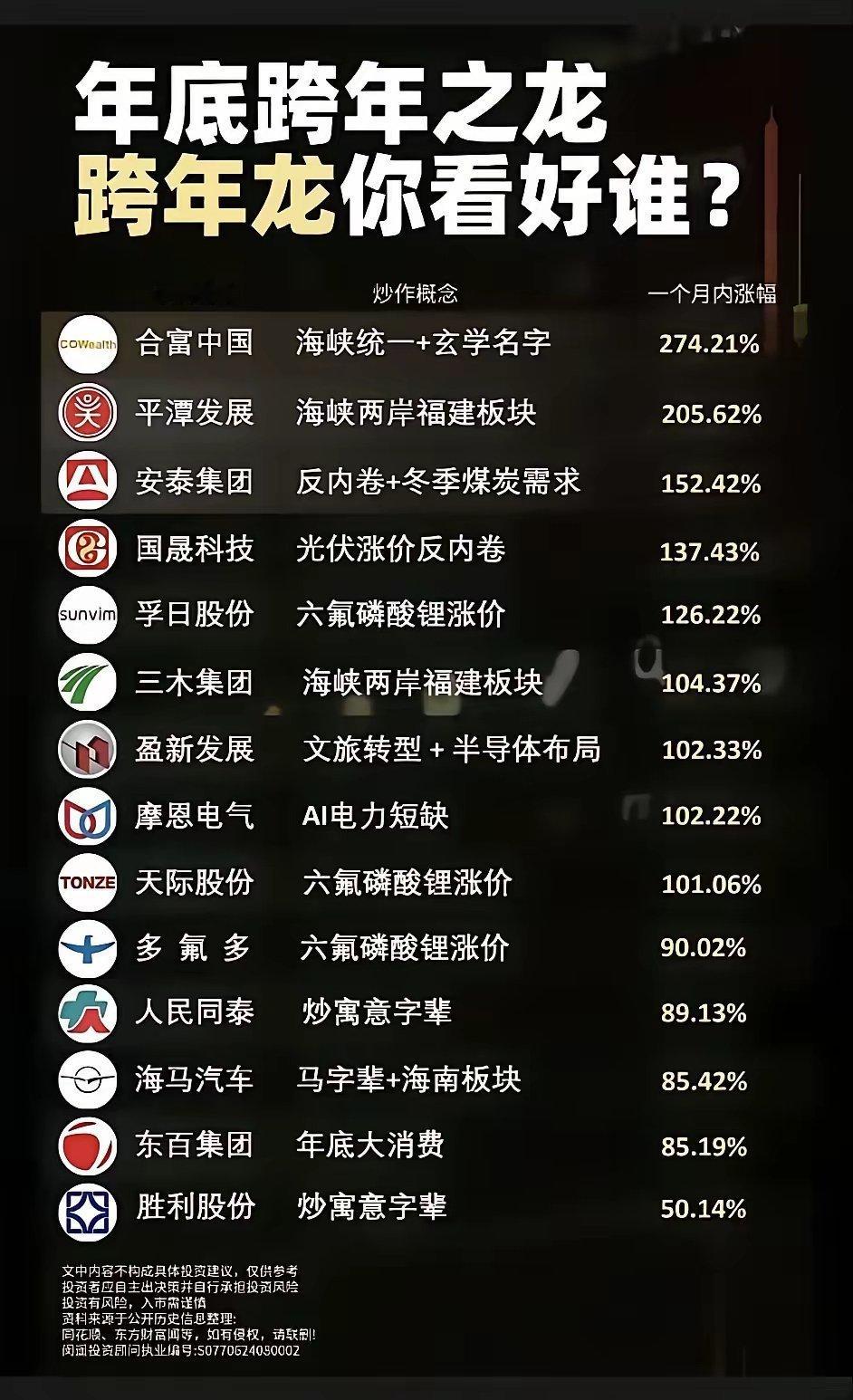 大胆预测一下,妖股不在这个里面。今年过年晚,有没有可能跨年龙在12月出现?已经大涨过的是不可能成跨年龙的,真正的龙还在底部趴着等启动。在大A里玩,必须得看名字好不好,要不然亏的一塌糊涂。在大a炒股,不看业绩,不看k线,妈妈的,讲玄学什么字辈儿,我靠,全球独一无二!能被你们这么容易想到的都不在这,我大胆猜一下,是福建板块。一看就不怎么专业,跨年妖里难道就不打算来个马字概念吗?妖股必须是孚日,最近感觉这个话题最热:俘虏本(因为它们不是人,所以没有了人字旁,怎么说,解释到位吗?