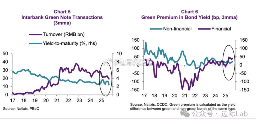中国银行间市场对绿色债券的配置兴趣已显著降温,其直接表现为绿色票据的交易额自2023年以来已萎缩50%。流动性的急剧下降直接导致了二级市场定价的扭曲,自2025年初以来,绿色票据的到期收益率呈现出远超以往的剧烈波动,反映出市场深度不足已严重影响其价格稳定性。金融机构发行绿色债券的融资成本优势也已发生逆转,其“绿色溢价”在2025年已由负转正并急剧攀升。历史上,金融机构发行的绿色债券长期享有比非金融企业更低的溢价,但目前其溢价水平已反超至非金融企业的两倍。来源:法国外贸银行(《银行在中国绿色转型中的角色:更大还是更糟?》,详细内容请见《财经图集》知识星球)