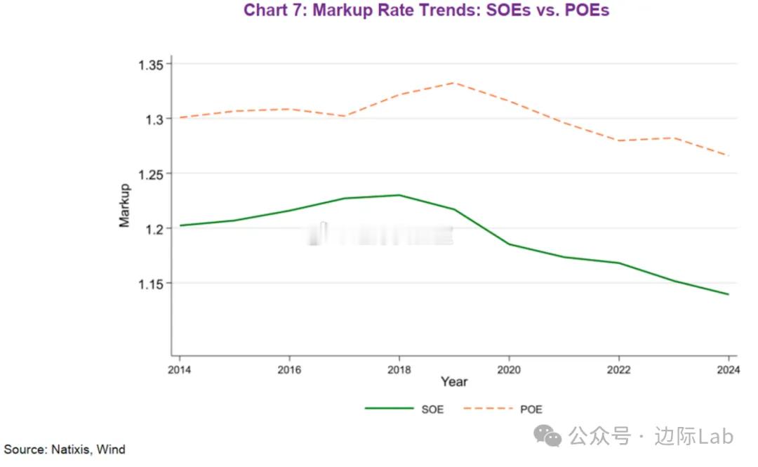 从企业所有制来看,中国民营企业的定价能力历来强于国有企业,但在2019年后,两者的价格加成水平均出现下滑。具体而言,2014至2019年间,民营企业的价格通常是其成本的1.30至1.33倍,而国企则为1.20至1.23倍;到2024年,国企的这一水平已降至1.15倍以下,降幅更为显著。国企占比较高的行业(如电力、矿业)利润下滑更严重,这可能与其需承担社会责任、而非以利润最大化为首要目标的政策导向有关。来源:法国外贸银行