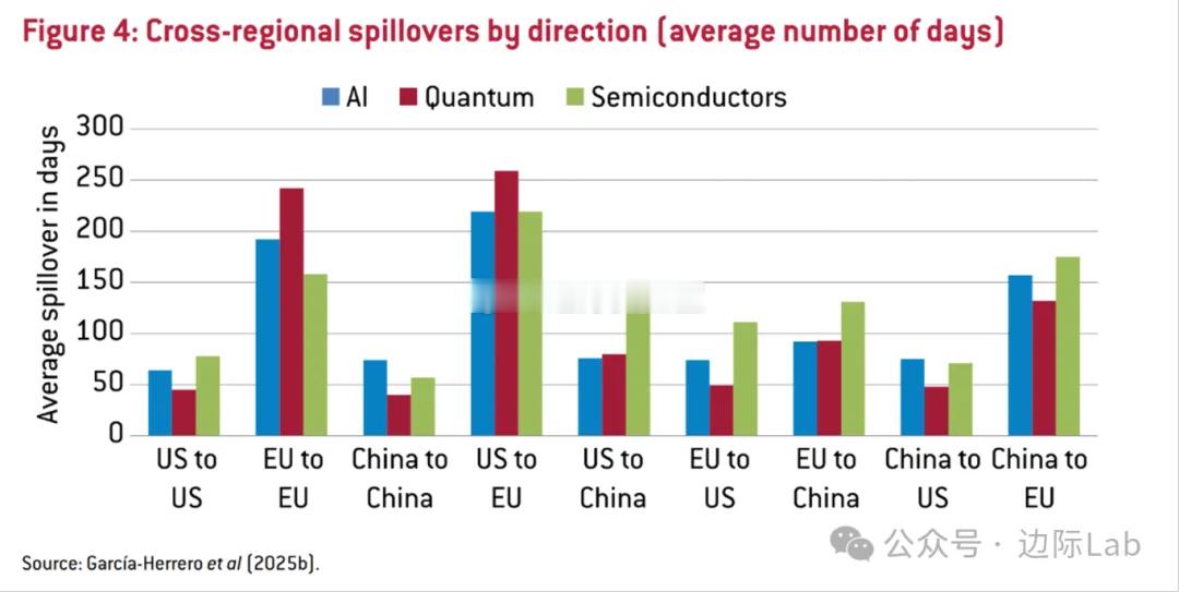 一项关于关键技术领域知识溢出速度的分析显示,中国在复制颠覆性创新方面展现出惊人的速度,尤其在人工智能领域,复制来自美国或欧盟的新专利平均仅需约70天。美国同样具备快速复制的能力,中美之间的技术双向流动非常明显。相比之下,欧盟在技术复制方面则明显迟滞,无论是在人工智能、半导体还是量子计算领域,欧盟国家平均需要超过200天才能复制来自美国或中国的新技术。更值得注意的是,欧盟内部的知识溢出速度同样缓慢,其成员国之间互相复制创新成果的时间甚至比复制中国专利所需的时间更长,凸显出其创新生态系统内部存在的显著壁垒。来源:法国外贸银行(《欧洲能从中国的关键技术创新推动中学到什么?》,详细内容请见《财经图集》知识星球)