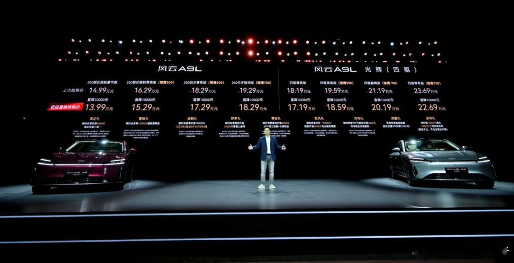 奇瑞风云A9L光辉版上市:17.19万起11月15日,奇瑞A9L光辉(四驱)版正式上市,共推出四款版型,售价区间为17.19万-22.69万元。风云A9L上新260伯牙智领版(猎鹰700),超级置换抢购价为18.29万元。随着光辉版的上市,奇瑞风云A9L目前共有8款车型在售,售价区间为13.99-22.69万元。风云A9L车身尺寸方面,长宽高分别为5018/1965/1500mm,轴距达3000mm。内饰方面,采用悬浮式数字仪表,15.6英寸的中控触摸屏,智控中岛集成13.7L智能冷暖冰箱,支持-18℃至50℃宽域温控,隐藏式桌板、50W无线充电。辅助驾驶上,猎鹰700版本配备Momenta R6大模型端到端驾驶,激光雷达同步上车,支持城市/高速NOA、代客泊车、智能召唤等场景应用。动力方面,新车搭载鲲鹏超能CDM 6.0动力系统,由1.5T发动机与电动机组成,发动机最大功率115kW,单电机车型最大功率为275kW,峰值扭矩530N·m;双电机四驱车型综合扭矩达470kW,综合扭矩达854N·m,零百加速4.9秒。采用33.67度的磷酸铁锂电池,CLTC纯电续航全系260公里,满油满电实测续航跑到2500公里,WLTC馈电油耗4.85L/100km,30%-80%快充时间为14.5分钟,同时还拥有3.3kW对外放电功能。