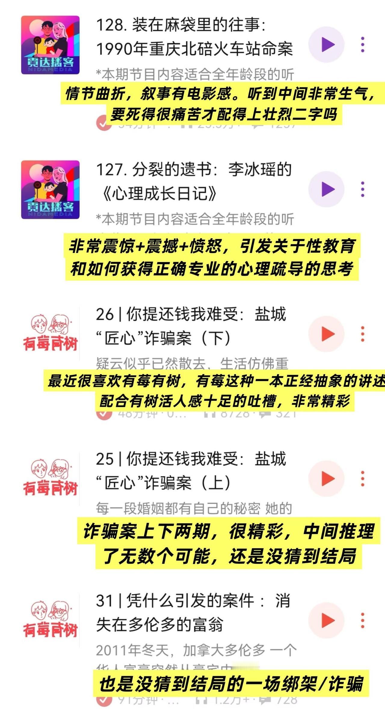 近期推荐的罪案播客单集🎧9/10 双月 俩月差不多听了150+ 集,推荐标准: 1️⃣2025.9/10月更新 2️⃣听的时候会让我产生强烈情绪波动(比如破口大骂,比如老泪纵横,比如笑哭,比如停下车来狂翻评论区) 播客 小宇宙 罪案播客