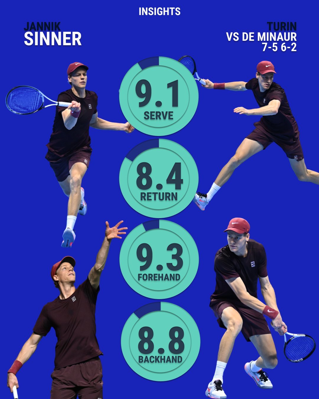 阿卡和辛纳都在总决赛半决赛拿出了巨星级别的表现:阿卡 - 正手9.1,反手8.5,接发9.1,发球8.7,得分转换73%,偷分42%,全场表现9.47。辛纳 - 发球9.1,接发8.4,正手9.3,反手8.8。室内硬地辛纳已经30连胜了,本周他的发球处于职业生涯最好的时期,但也只有阿卡能在都灵击败他。至于怎么打?阿卡得确保接发9分以上的发挥,底线不同方式调动辛纳,还得在压力分上超级稳定。双巨头时代,或者是双骄时代,正式来临。