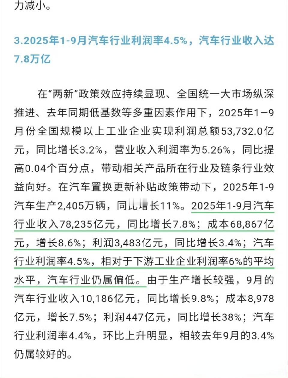 今年1-9月,汽车行业利润率4.5%,从整个工业体系6%的平均利润率来看,汽车行业的利润率真低。 不过今年9月汽车行业利润率4.4%,去年9月汽车行业利润率3.4%,反内卷取得初步成功。【来自懂车帝车友圈】