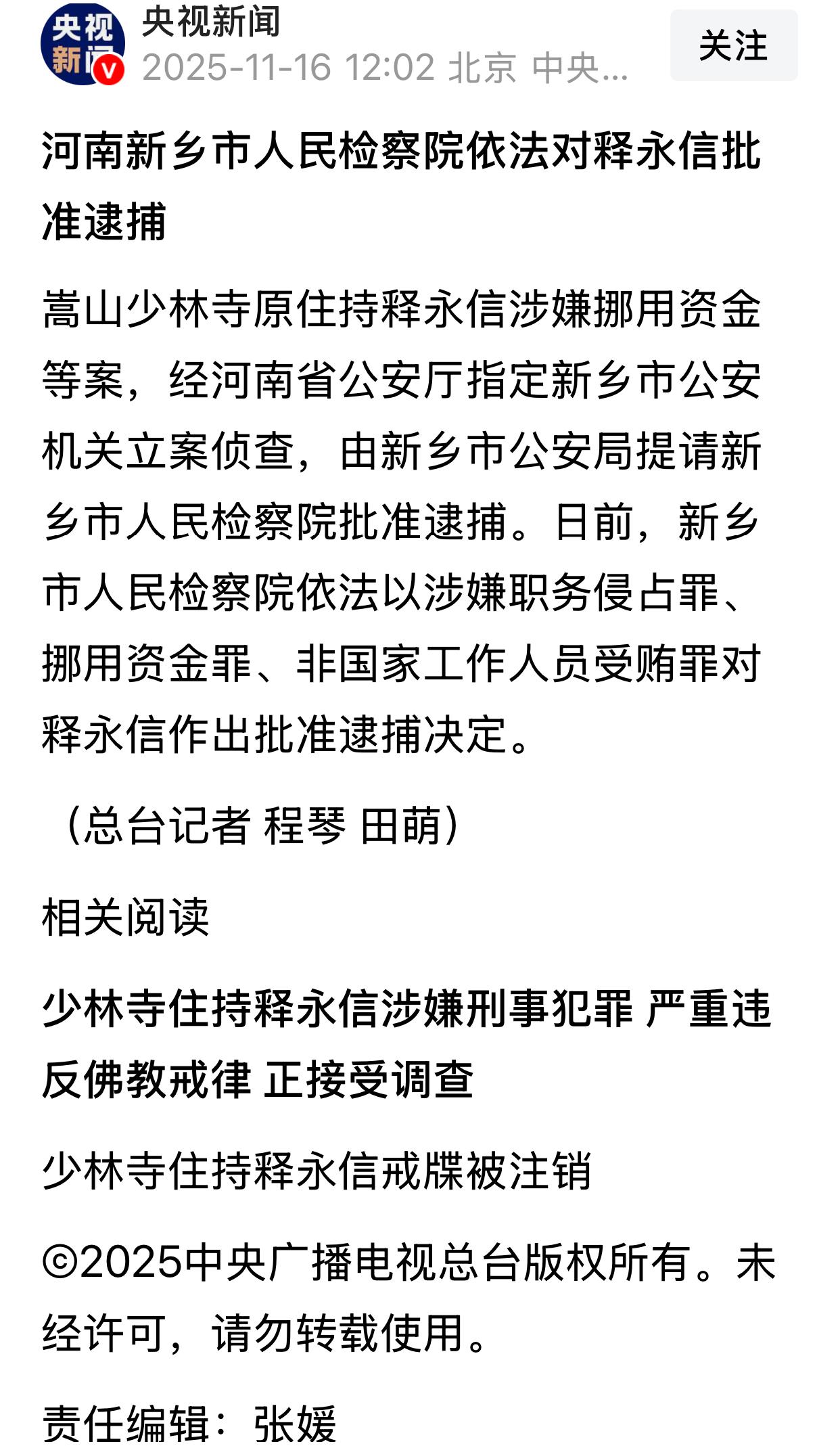释永信被批捕了。它的事儿,传了不止一两年了,想想大概得有十几年了吧?为什么现在才处理?值得深思。记得很多年前,很多人以和释永信合影为荣,其中不乏很多知名人士。大家还记得都有谁和释永信合影过吗?好像是有那个被很多人称为“爸爸”的人。还有谁?
