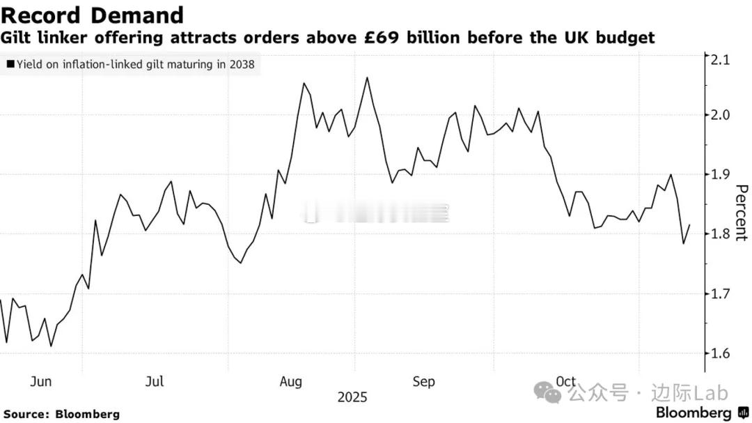 在11月26日财政预算案公布前夕,英国一次通胀挂钩债券的发行吸引了创纪录的超过690亿英镑认购订单,远超42.5亿英镑的实际发行规模。此次强劲需求使得该批债券的最终定价较可比证券高出10.5个基点,其背后是市场对英国央行降息预期的增强,货币市场目前已消化了明年底前最多三次降息的可能性。这一预期的转变源于近期数据显示通胀稳定以及失业率意外攀升至5%,同时,市场猜测即将公布的预算案可能包含增税措施,此举或将抑制经济增长,从而提升了通胀挂钩债券的吸引力。来源:Bloomberg