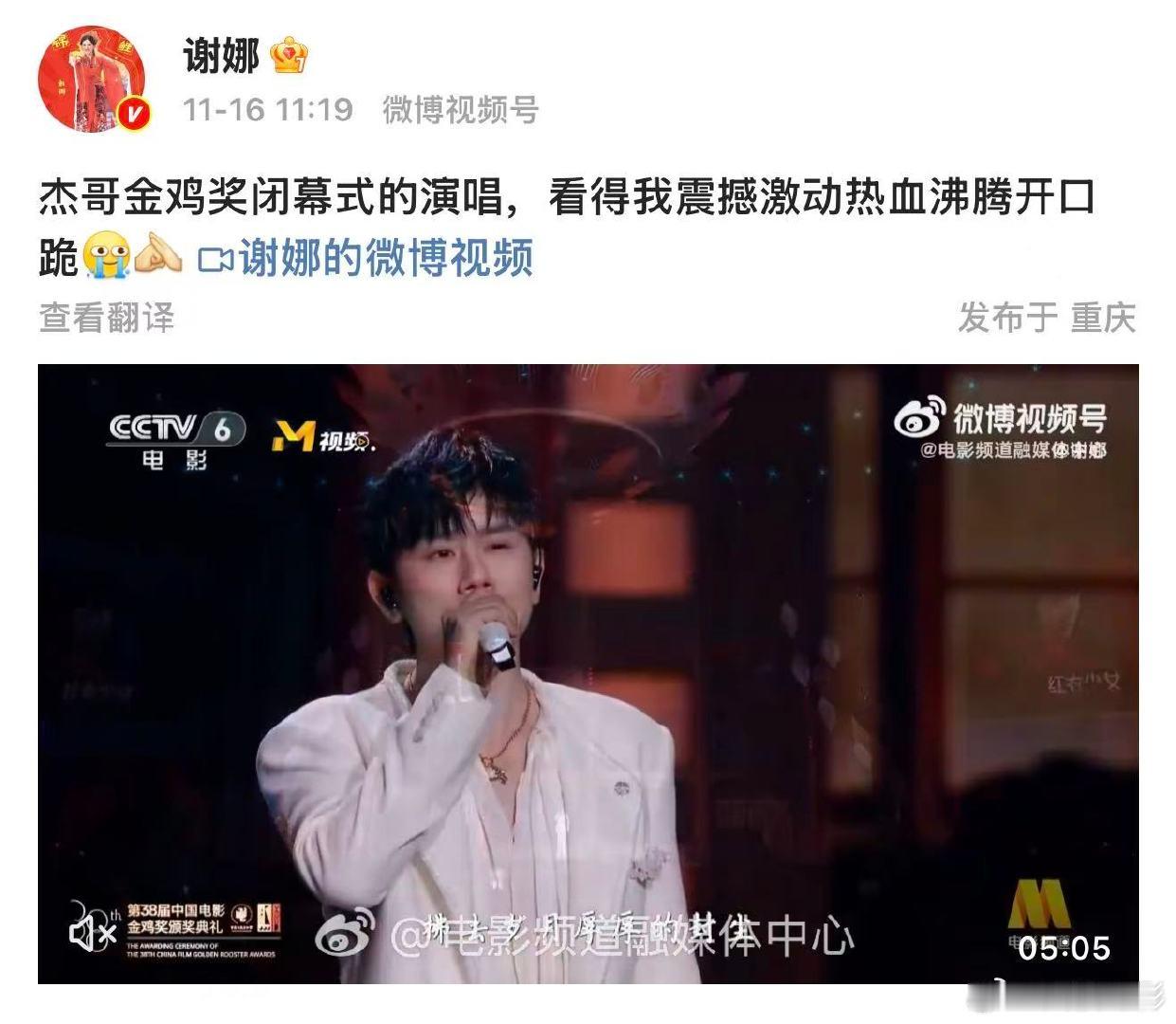 11月16日, 发文说看 金鸡奖演唱热血沸腾,还用11个字形容心情“杰哥金鸡奖闭幕式的演唱,看得我震撼激动热血沸腾开口跪 ”
