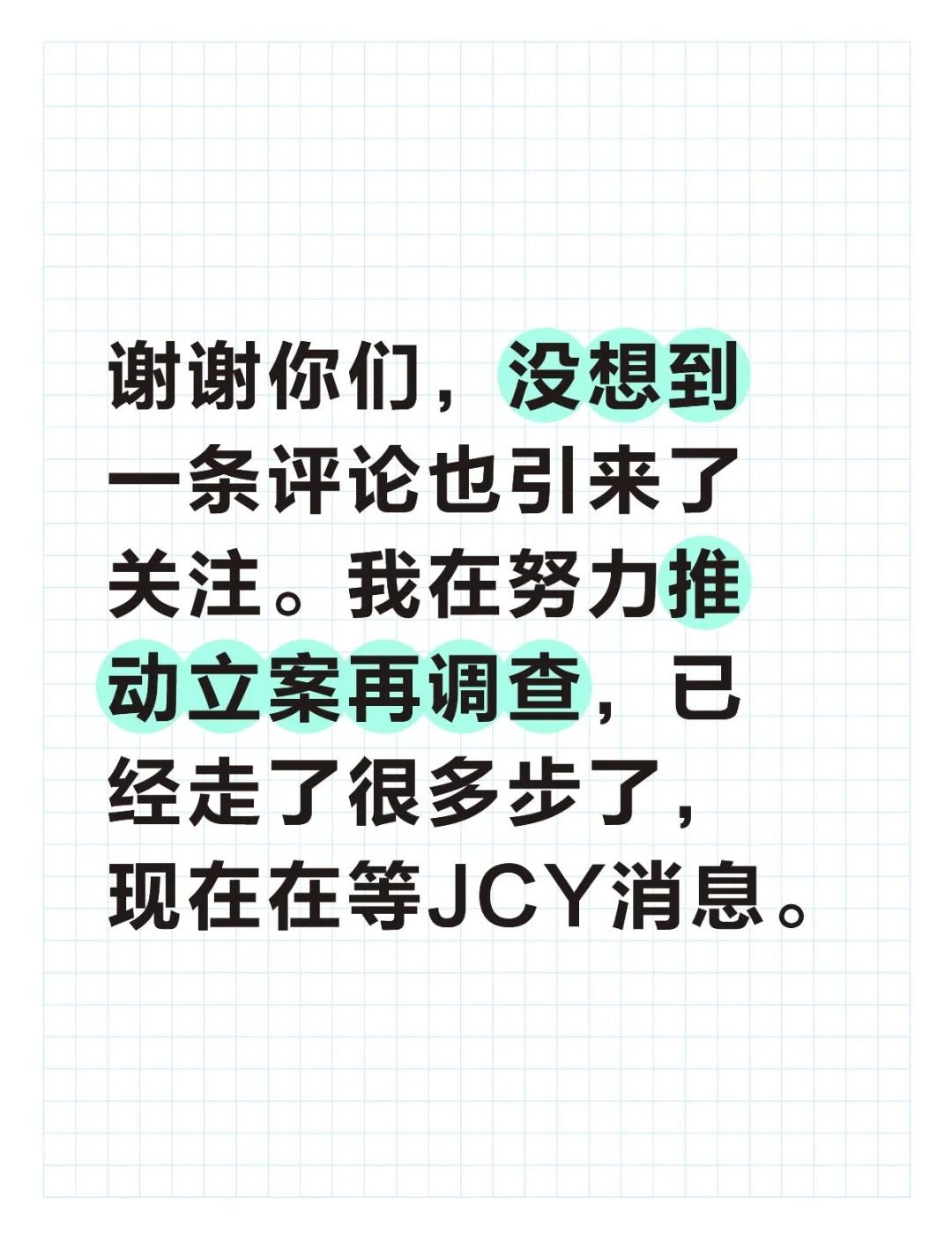 谢谢你们,没想到一条评论也引来了关注。我在努力推动立案再调查,已经走了很多步了,现在在等JCY消息。