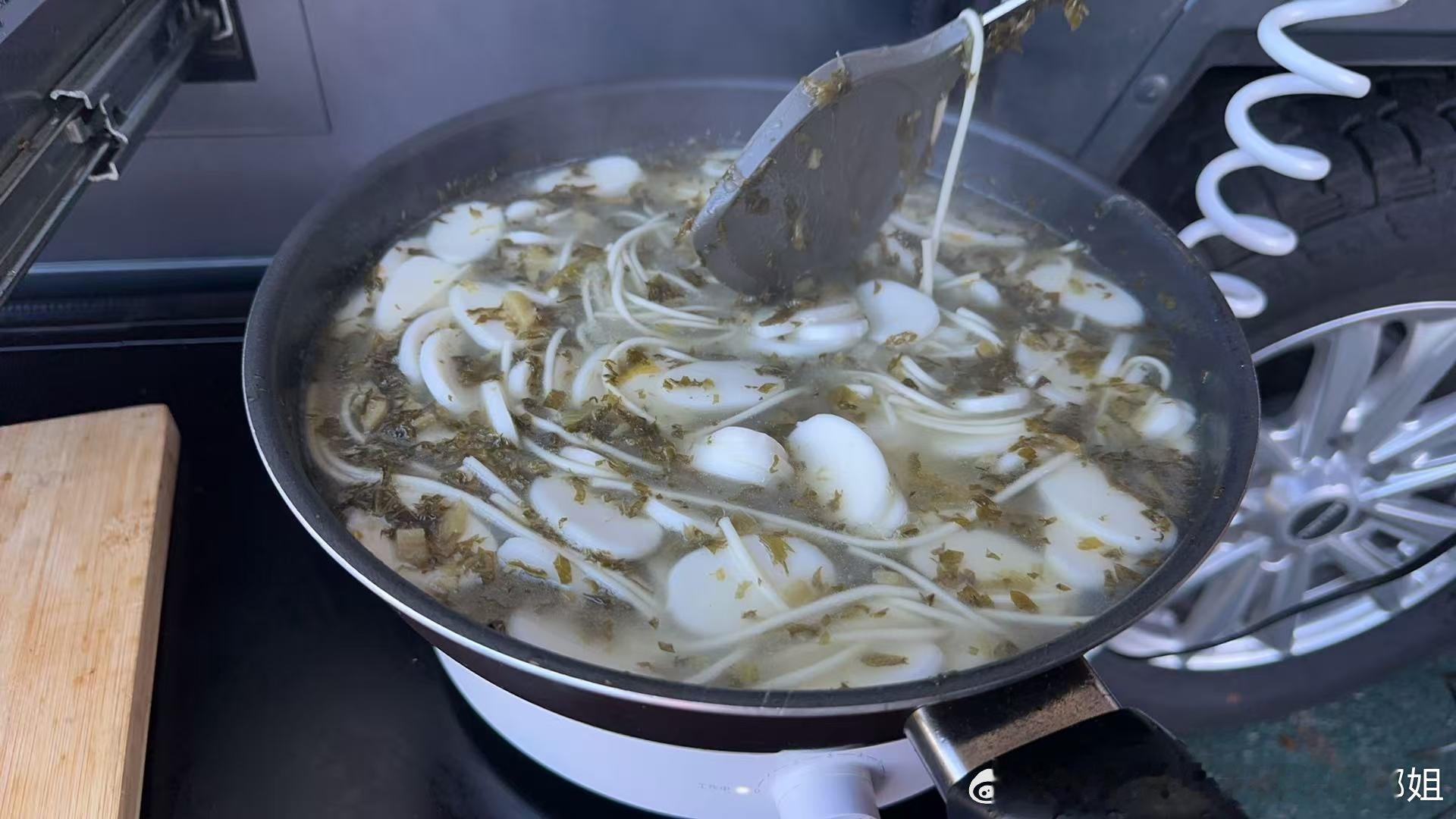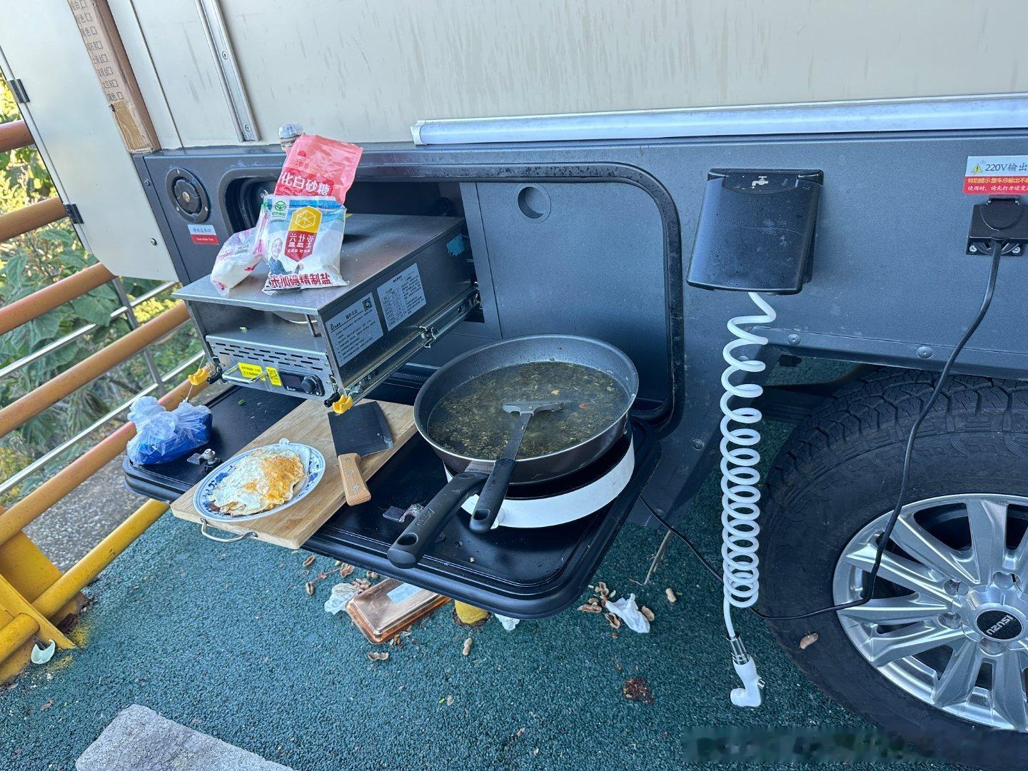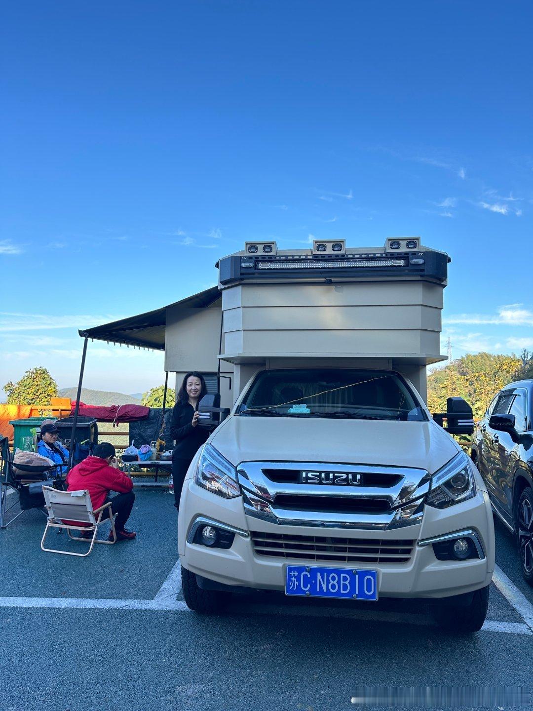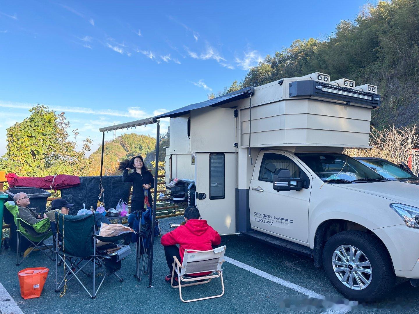 老铁们昨天晚上去四明山露营他们总是能把普通日子过的非常开心年糕面条鸡蛋非常普通但是在清风的山上吃味道老好关键蓝天秋色太美了 昨天晚上他们住房车了三个女人通铺男人地铺