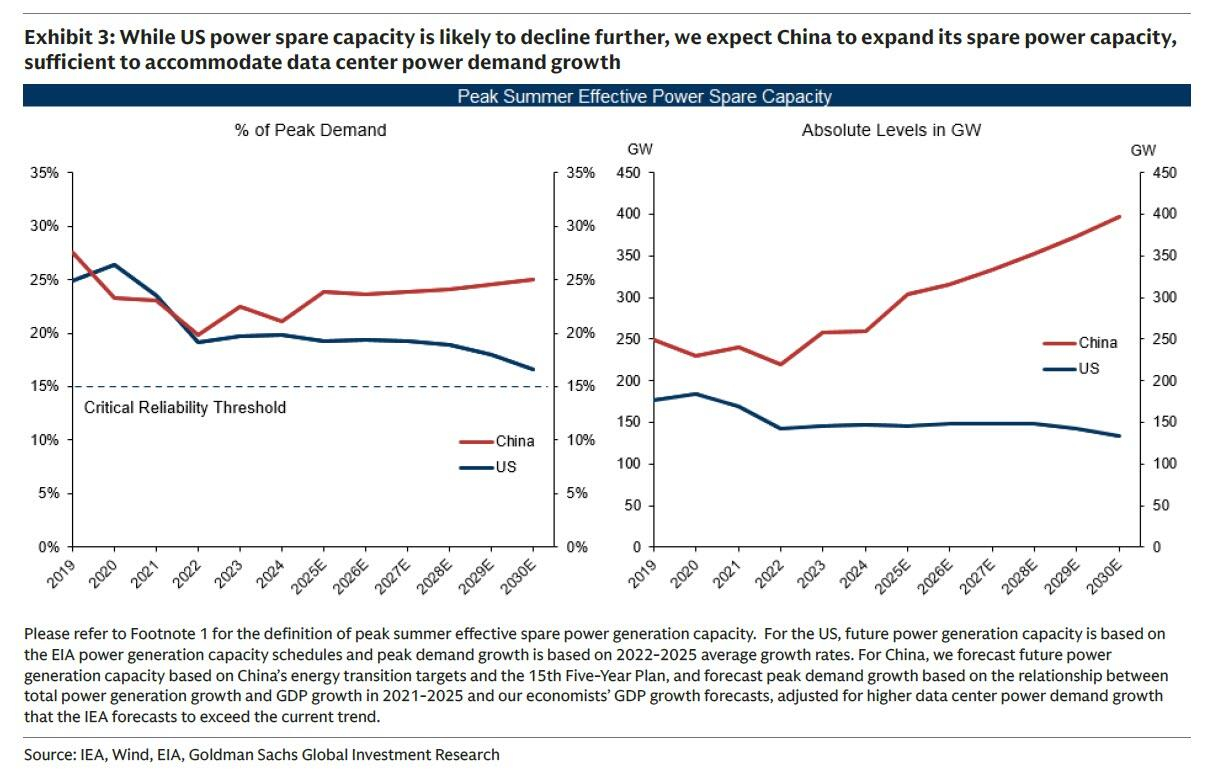 高盛:AI竞争由电力决定,美国会输掉与中国的人工智能竞争,核心指标是“备用发电能力”最近美国搞AI的非常关注电力,甚至将它上升到比GPU还重要的程度了。道理很简单,GPU算力并没有瓶颈,因为一代代GPU的性能不断提升,GPU产能扩张也不难。所以,算单个token成本与收入的tokenomics,关键因素就变为能源,也就是电力。GPU起的作用就是把电力变成token赚钱,电力是源头。现在电力真的成为瓶颈了。中国不太容易理解美国为何如此关心电力,因为对电力瓶颈没有直觉。一个例子是微软2024年500亿美元采购的48.5万块H100,一半在货架上闲置18个月,因为没有电力。CEO纳德拉说,"整个AI行业的投资逻辑都错了,市场根本没有对相关公司进行重新定价。真正的瓶颈早已不是芯片,而是电力"。技术原因是数据中心基建与采购的速度,各项差异很大。美国大公司搞AI不缺钱,但需要把基建和设备弄好。其中GPU采购周期最短,按季度估算就行。数据中心建设也好办,1-2年就能建好。电网接入审批要5年,最卡的是输电线路建设,需要10-17年。物理上,GPU集群是电老虎。5000块H100的集群需要超过350兆瓦电力,堪比中型城市用电量。其实按中国标准也不高,但电网是非常精微复杂的,发电与用电处于紧平衡中,波动处理不了电网就可能崩溃,这是数据中心无法接受的。电网白天夜晚本来需求波动就很大,美国大停电都发生过。现在AI数据中心新出来,目前占整体用电的0.8%,已经很头疼了,2030年要占3%-6%,如何解决很麻烦。因为美国还在不断退役燃煤电厂,年头太老了是要退,本来电网就不是很好。核心指标是“备用发电能力”。理解这个数值不容易,但美国备用发电能力已经从26%降到了19%,警戒线是15%,再低就会频繁发生电网崩溃。可以把它理解为蓄水池,物理上对应电网系统中高速旋转转子的转动惯量。电力需求波动来冲击电网,转子多就能消化波动,不够的话电网会出事,如变压器炸掉。中国为此不惜大建燃煤发电厂!不是为了多发电,而是作为“备用发电能力”调节电网,作为清洁能源的配套,非常奢侈的打法。有了调节能力,波动巨大的风电光伏才能真正接入电网。中国是全球电力电网绝对王者,规模和技术都遥遥领先,没有之一!我以前就介绍过中国为了发展新能源发电,反而增加了燃煤电厂建设的奇怪行为。原理上就是为了增加电网中转子的数量,增加电网稳定性与消纳能力。这与储能并不是一回事,很复杂。图一是中美备用发电能力发展趋势。中国在2021年末一度也危险了,因为限制燃煤电厂过头了。后面重视问题,数据向好,备用发电能力绝对值大幅上升,解决得非常好。而美国备用能力就一路下滑,让高盛非常担心,甚至认为AI竞争要输给中国了。图二是中美备用发电能力细分规划,蓝色是总的备用能力,2025年2030年。绿色的是水风光清洁能源补充,美国把核电和天然气发电也算进去了;红色的是燃煤发电补充。可以看出中国各项补充都不弱,用红色的燃煤发电补电网远多于绿色。而美国就补得不行,到2030年电网备用能力堪忧。高盛还有不少美国机构对电力的担忧,可能有些夸张,强调中国优势,是一种“要求美国重视大力投资电网”的舆论宣传。其真实意图并不是说中国要赢了,而是说,如果美国不重视解决电网问题,中国就赢了,要注意理解。舆论宣传上力度了,美国对电力的巨额投资来了,高盛提前布局的核电之类的电力股就可以获利几倍套现了。