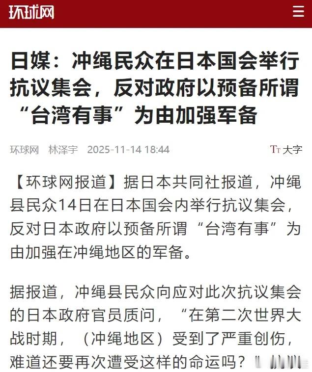 果然被我猜中了日本方面宣布了!11月14号,日本国会大厦里闹成了一片。冲绳的老百姓们涌进去举着标语喊口号,就为了反对日本政府借着“台有事”的由头,一个劲在冲绳加派武器、搞军备。11月14号日本国会大厦里的那场喧闹,说白了就是冲绳人积压了上百年的委屈彻底爆发了,举着标语喊口号的每一个人,心里都装着一本算不清的血泪账,反对政府借着“台有事”的由头加派武器,不过是压垮骆驼的最后一根稻草。毕竟这地方从根上就没被日本政府好好对待过,先是被强吞的亡国之痛,再是二战时被当炮灰的灭顶之灾,战后又成了美军基地的“集中营”,现在还要被捆上地缘政治的战车,换谁都得跳出来反抗。要聊冲绳的命苦,得从琉球王国那会儿说起,人家本来是个独立的国家,跟咱们明清时期还保持着朝贡关系,商船往来频繁,日子过得也算安稳。可日本明治维新后眼馋这片海域,1879年直接派兵占领,把琉球王国改成了冲绳县,从此冲绳人的好日子就到头了。日本政府压根没把这里当自己人,而是当成掠夺资源的殖民地,当地传统习俗被强行禁止,连语言都要改成日语,这种文化上的压制,比抢地盘更让人难受。可这还只是开胃菜,真正的灾难在二战时铺天盖地袭来。1945年的冲绳战役,成了当地人永远的噩梦,这场打了三个月的仗,把整个冲绳炸成了废墟。美军和日军在这里死磕,冲绳平民却成了最无辜的牺牲品,当时全县也就五十多万人口,战后统计下来,光平民就死了十四万,差不多每四个人里就有一个丧命,用户提到的88岁小岭达雄老爷子就是幸存者,10岁那年亲眼看着亲人被日本政府逼着“殉国”,那种失去所有亲人的痛苦,不是靠时间就能抹平的。更让人寒心的是,当时日本军队为了所谓的“圣战”,给平民分发手榴弹让他们自杀,还编造美军会屠村的谎言,把老百姓往绝路上逼,这种由自己“国家”带来的伤害,比敌人的炮火更扎心。本以为二战结束就能熬出头,没想到冲绳又成了美军的“自留地”。1972年美国把冲绳施政权还给日本,可却没把基地撤走,反而越建越多。要知道冲绳全县面积才占日本的0.6%,却硬生生扛下了全日本70%的驻日美军基地,这些基地像补丁一样盖在冲绳的土地上,占了本岛18%的陆地面积,全是海边、平原这些好地段,当地想发展旅游业都没地方下手。美军基地带来的麻烦更是没完没了,噪音污染成了周边居民的日常,2022年光是美军北部训练场周边,就测得三千多起噪音事件,大半夜的军机起降声能把人从梦里吓醒,长期生活在这种环境里,老人小孩根本受不了。更要命的是安全问题,2022年一年,美军在冲绳就闹出54起刑事案件,比日本其他九个有美军基地的地区加起来还多,抢劫、伤人是常事,1995年三名美军士兵绑架强暴12岁小学女生的事,直接引发了几十万人的大游行,可就算这样,美军犯罪后还能靠着“治外法权”逃避惩罚。交通事故也没断过,这么多年下来,美军车辆已经造成超过四千名冲绳民众死伤,去年还有架美军直升机在小学旁边坠毁,幸好是周末没学生,不然又是一场惨剧。基地带来的不仅是安全隐患,更是经济上的拖累。冲绳的人均收入只有日本全国水平的七成,常年排在最后一名,按理说这么好的地理位置发展旅游业绰绰有余,可到处都是基地和军事禁区,游客来了连个干净的海滩都难找。冲绳知事玉城丹尼算过一笔账,如果把美军基地占的土地拿回来搞开发,收入至少是现在的三倍,可日本中央政府根本不管这些,一门心思跟着美国搞军事部署。当地民众的抗议从来就没停过,2023年9月日本最高法院驳回冲绳县政府反对新建基地的上诉后,七百多人连夜在那霸市集会抗议,还有人驾着橡皮艇闯进填海工地阻拦施工,跟警察发生冲突。2021年更是有二十艘橡皮艇冲进工程限制区,就算被海上保安厅拦截,大家还是喊着“停止非法施工”不肯退让,这种反抗不是一时冲动,是常年被忽视后的必然爆发。现在日本政府又借着“台有事”的名头往冲绳加派武器,在宫古岛、石垣岛这些离台湾只有几百公里的地方部署岸舰导弹,还要增派两千多名陆上自卫队士兵,明眼人都看得出来,这是把冲绳当成了地缘政治的前哨站,一旦真有冲突,冲绳肯定是第一个挨打的。日本政府在本土搞和平宣传,却把冲绳人往火坑里推,这种双重标准谁能接受。小岭达雄老爷子现在还会给年轻人讲当年的惨状,就是怕大家忘了被当炮灰的滋味,可日本政府根本不管这些,眼里只有跟美国的军事同盟。冲绳民众心里跟明镜似的,加派再多武器也不是保护他们,而是把他们绑在战车上,之前的历史已经证明,真到了关键时刻,他们永远是被牺牲的那一个。