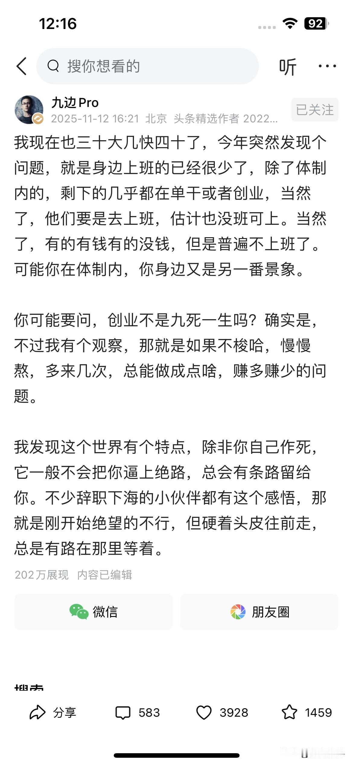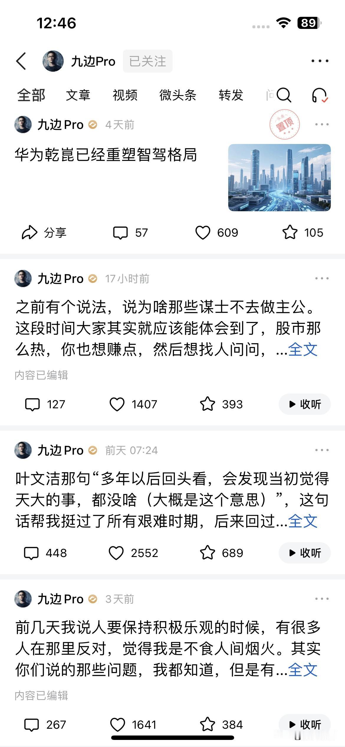 什么才是头条大咖! 像这样的才是头条真正的重量级大咖! 关注他一段时间了,几乎天天都看,喜欢看看他的微头条,更喜欢看他的展现量,他的每一条的微头条展现量都高,点赞量和评论量也很高。 我看他发的微头条,没有固定时间,想发就发,有时候早上发,有时候下午发,不像素老三那样规定自己,他就没有,很随意。 写的,也就是一段小小不长的微头条,随便讲讲人生哲理故事,悟悟人生道理,也没有什么华丽的语言,有时候看了,感觉就是随意聊天的语境。 也没有美丽的配图,随手一扔,就发出去了 有时间,我也纳闷了,头条咋给他这么大的展现量,难道他是头条大咖? 有时间,心里也非常膜拜大咖,决定也向大咖看齐!
