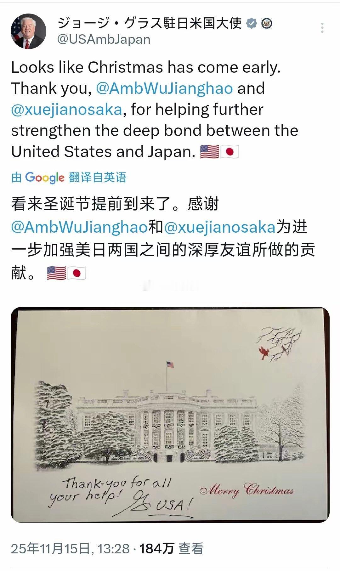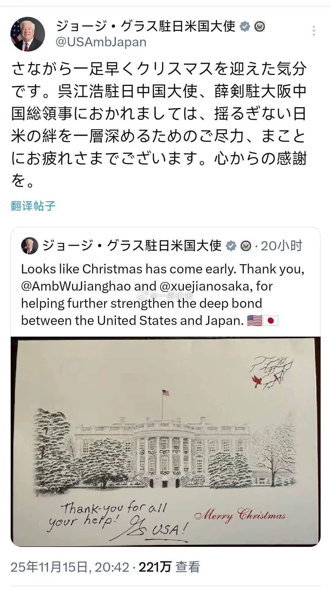 美驻日大使"圣诞隐喻"藏祸心,阴阳怪气挑拨中日关系尽显拙劣11月15日晚,美国驻日本大使格拉斯同步发布英文、日文声明,言辞暧昧地写道:“看来圣诞节提前降临了。感谢中国驻日本大使吴江浩、中国驻大阪总领事薛剑,为深化美日深厚友谊所做的贡献。”这段表态,堪称阴阳怪气的“高级黑”典范!当前中日关系正因日方挑衅陷入风波,格拉斯非但没有从中斡旋,反而摆出幸灾乐祸的姿态,将地区紧张局势比作“提前到来的圣诞节”,其妄图搅局的险恶用心暴露无遗。就连特朗普都尚且保持克制、不愿随意表态,格拉斯却上蹿下跳、频频煽风点火,本质就是想搅乱地区秩序,以此谋求美国的私利。他口中的“感谢”哪里是真心致意,分明是借话术恶意抹黑、挑拨中日关系。这般行径,毫无大国外交官应有的风度与担当,说到底,不过是个唯美国利益是图、为达目的不择手段的跳梁小丑罢了。