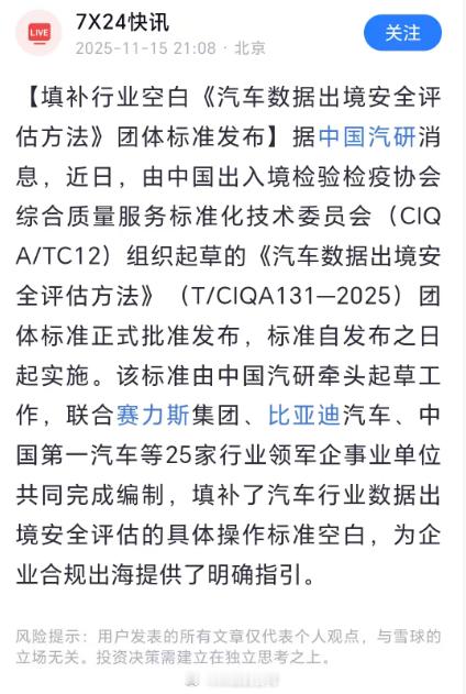 恭喜呀!又一标准填补行业空白啦~近日,由中国出入境检验检疫协会综合质量服务标准化技术委员会(CIQA/TC12)组织起草的《汽车数据出境安全评估方法》(T/CIQA131-2025)团体标准正式批准发布,标准自发布之日起实施。该标准由牵头起草工作,联合赛力斯集团、比亚迪汽车、中国第一汽车等25家行业领军企事业单位共同完成编制,填补了汽车行业数据出境安全评估的具体操作标准空白,为企业合规出海提供了明确指引。
