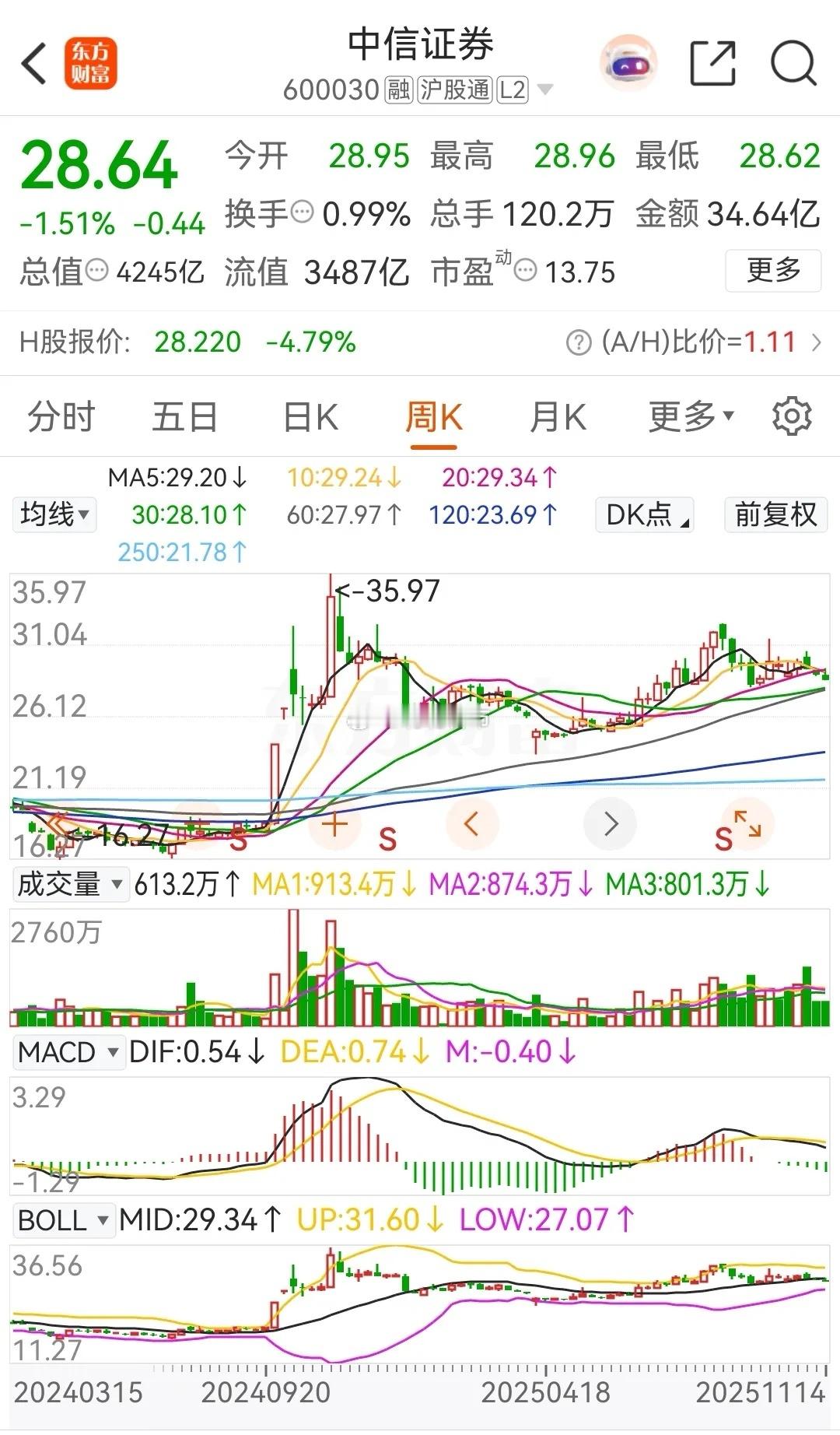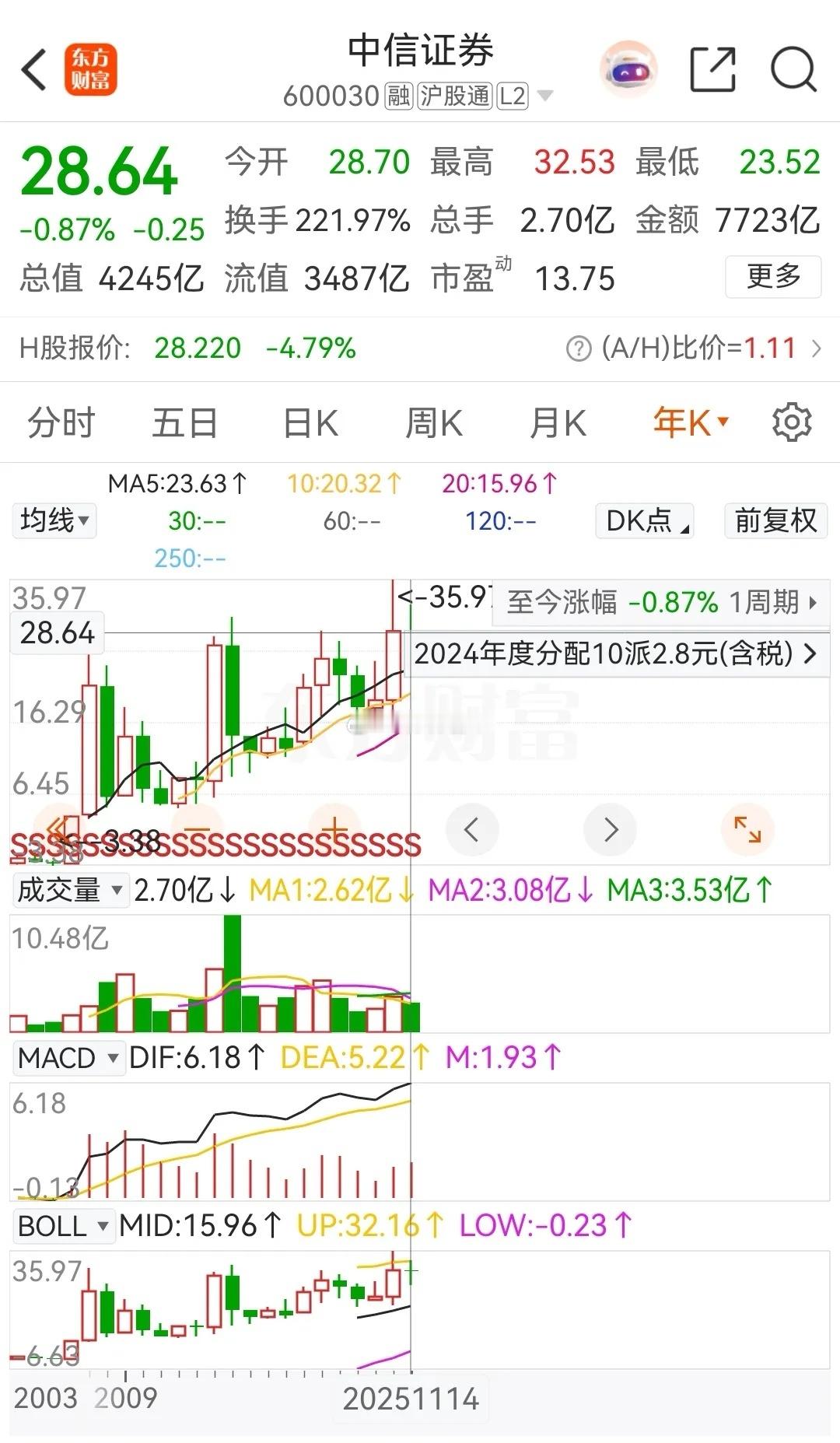 东方财富和中信证券连续3周下跌,本周分别跌了2.39%和1.24%,而2025年的涨幅分别为-4.74%和-0.84%,远低于券商概念板块的年内涨幅10.74%,令人唏嘘不已。下面先看看券茅和券商一哥周五的走势情况,当天东方财富低开低走下跌了2.53%,报价为24.54元。而在资金流向上,当日被主力资金大幅净卖出了约8.3999亿元,本周则是合计被净卖出了 20.8566亿元。再来看看中信证券周五当天的走势,同东方财富一样,也是低开低走,收盘时下跌了1.51%,报价为28.64元。在资金流向上,当天被主力资金大幅净卖出了约6.6376亿元,本周则是被主力资金合计净卖出了9.1672亿元。从技术走势上看,东方财富和中信证券目前依然是继续破位下跌,日线级别走势上股价已经跌到了半年线支撑位处,而周线走势则是三连阴,目前已跌破了 5、10和20周线,继续考验下方的支撑。众所周知,对于券商概念来说,已从传统“牛市风向标”或者是“牛市旗手”转变为监管层调控指数的工具。当指数需突破关键点位时(如4000点),资金会集中拉抬券商;当市场过热时,券商则被用于压盘。这种转变源于监管层“防急涨急跌、稳慢牛”的基调,避免重蹈2015年疯牛覆辙。另外,当前券商概念板块的估值已被深度折价。目前该板块PB仅1.52倍,处于2016年以来40%分位,而ROE(7.2%)预期达70%分位,形成显著“估值-业绩”剪刀差。虽然目前券商的走势不及预期或者是不尽人意,但还是有乐观的投资者认为,当下的券商概念板块正处于“黎明前的黑暗”,估值修复虽迟必到,这个过程中需要精准捕捉政策与资金的共振点。操作上,当前宜保持“底仓+机动仓位”即可。