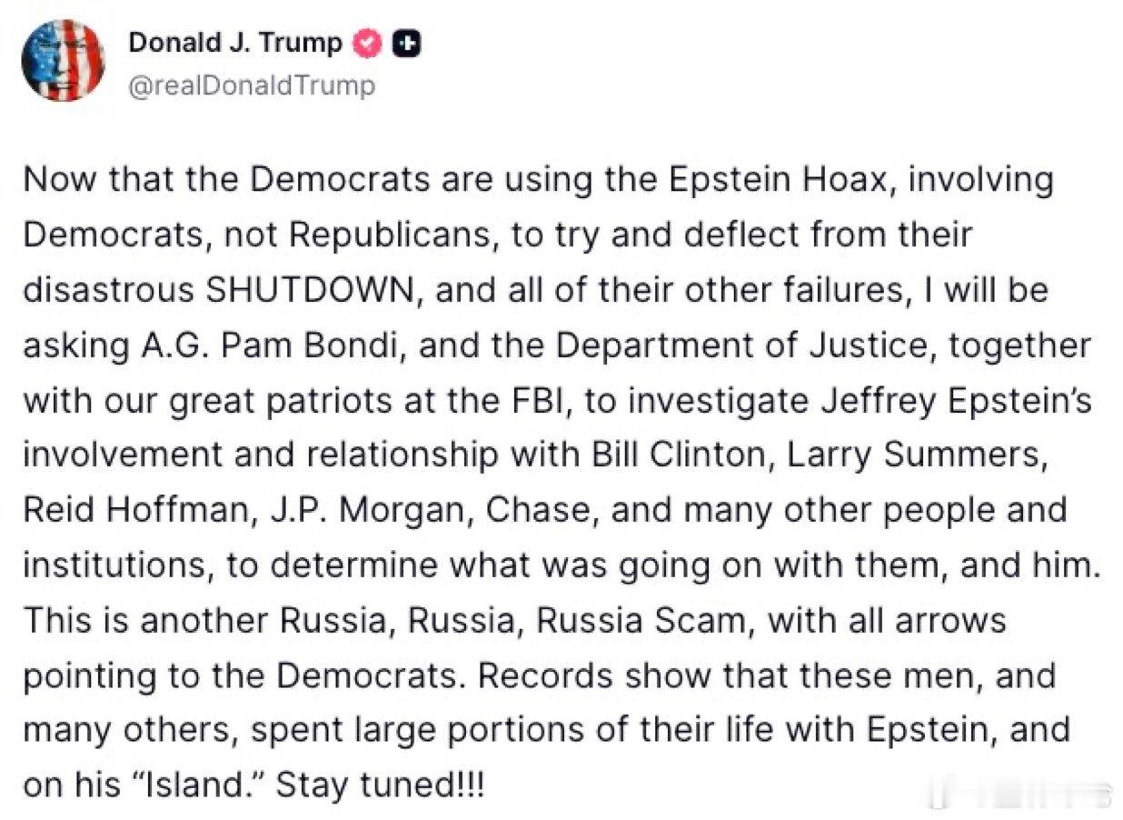 天哪。川普刚刚表示,他将动用司法部的全部力量去追查克林顿以及爱泼斯坦真正朋友的下落。民主党人刚刚掉进了一个陷阱。左派被诱导去在意爱泼斯坦的事,因为他们以为这会牵连到川普。天才,天才!