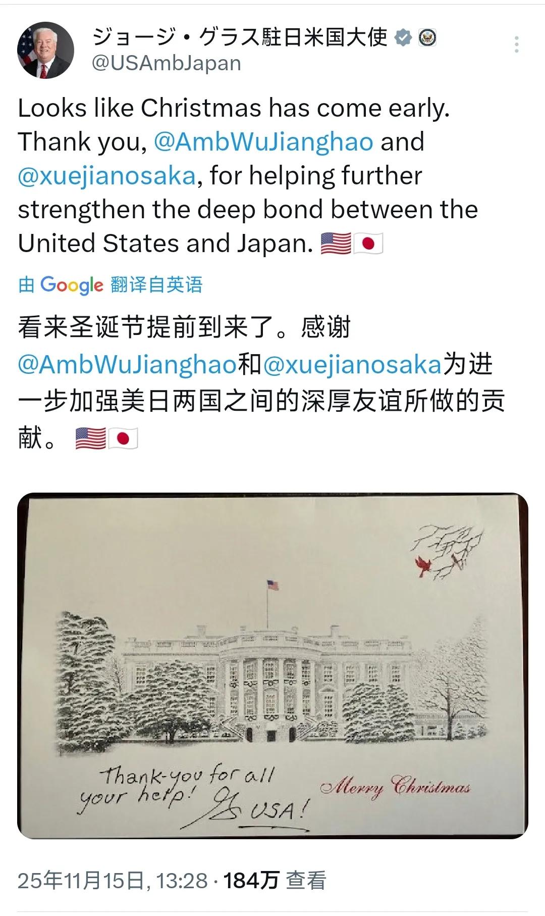 美国驻日本大使格拉斯昨晚(11月15日)写道:“看来圣诞节提前到来了。谢谢。感谢中国驻日本大使吴江浩和中国驻大阪总领事薛剑为进一步深化美日之间的深厚友谊所做的贡献。” 印太战略推出十年了,终于培养出一个“合格”的打手、奴才、代理人,确实不容易,格拉斯也是欣喜若狂,近日屡屡发表涉华负面言论,与资深媒体人胡锡进隔空论战,被批得体无完肤,以惨败告终。提前过圣诞节的言论似曾相识,当年麦克阿瑟将军说在圣诞夜前结束朝鲜战争,返回美国过圣诞节,结果被志愿军打回三八线。