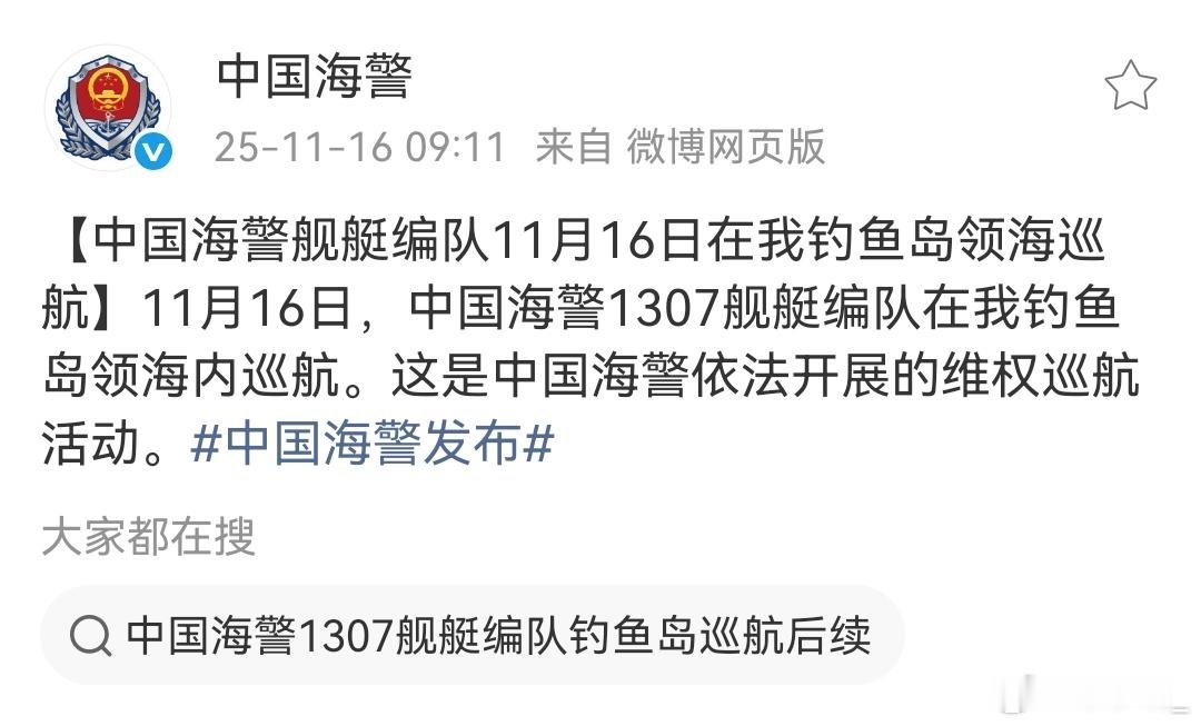 日媒称中国海警局今天宣布,当天在钓鱼岛领海开展巡逻活动。日本海上保安厅尚未公布有关信息。 中方正在加强对高市早苗涉台言论的回应,在这个时候宣布实施巡逻,似乎是为了向日本和国外表明它正在加大对日本的压力。中国海警每个月都在钓鱼岛领海开展巡逻活动,中国海警今天的公告没有提及高市的言论。中方似乎正在准备对日本采取各种措施。