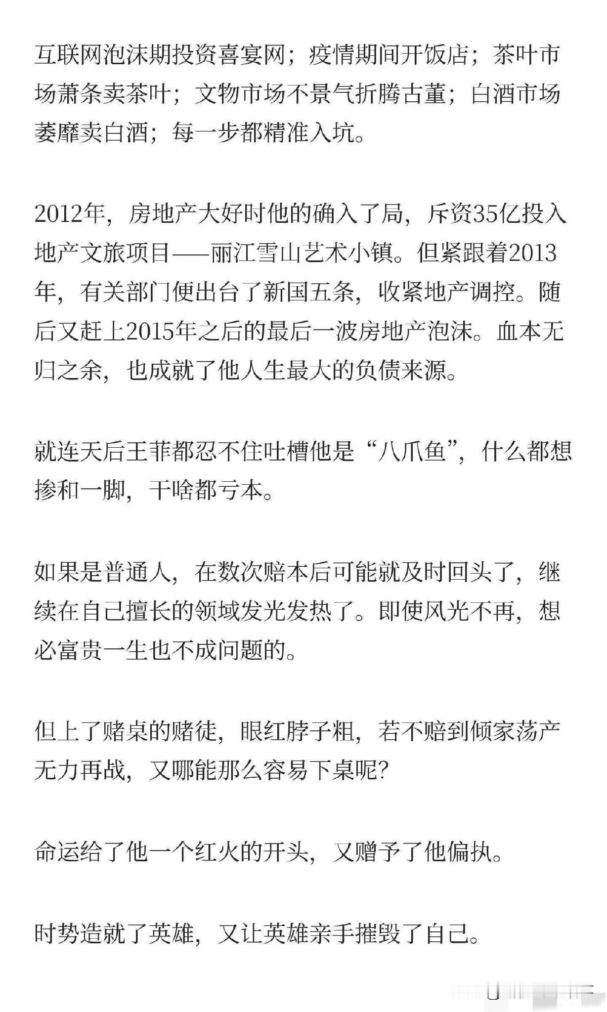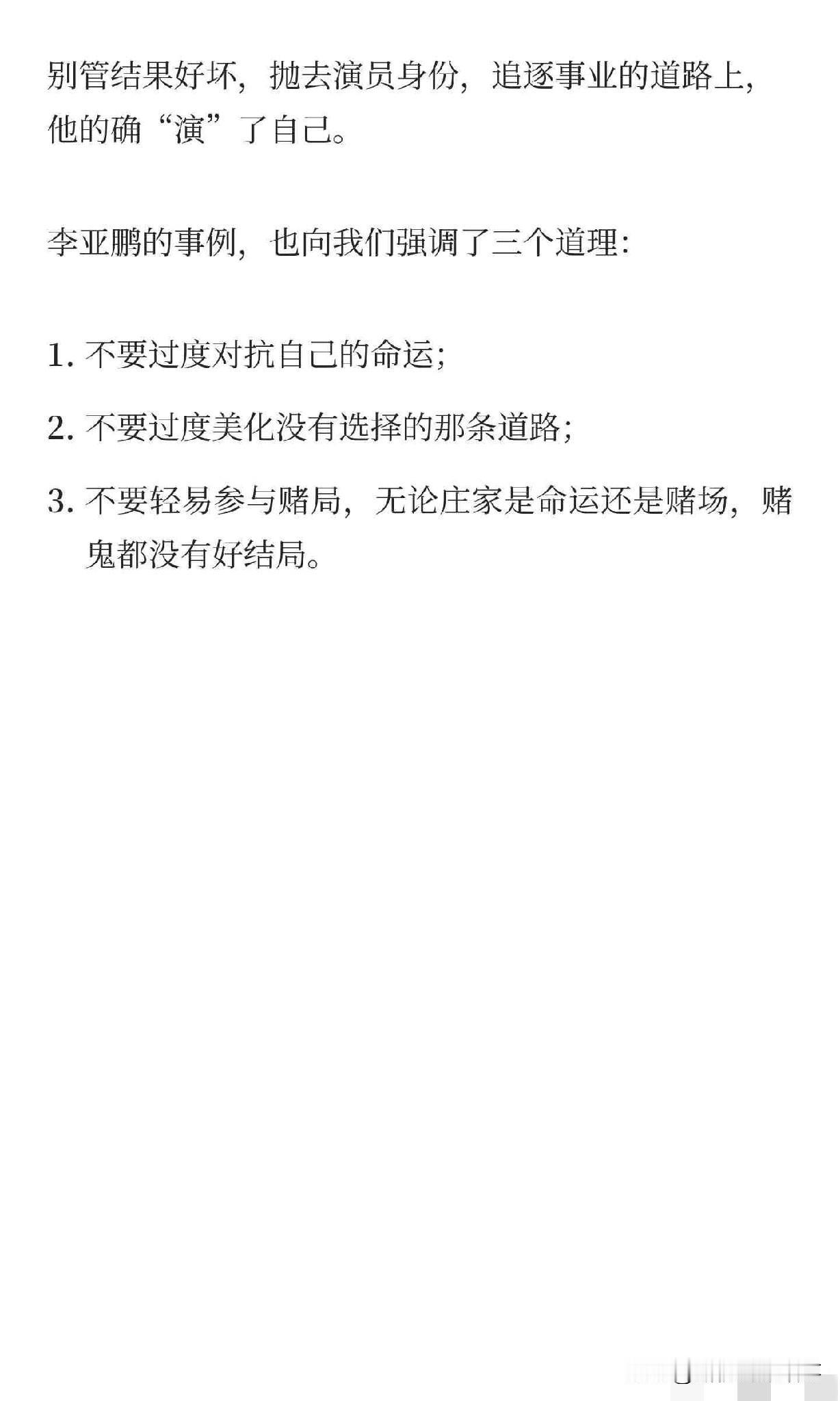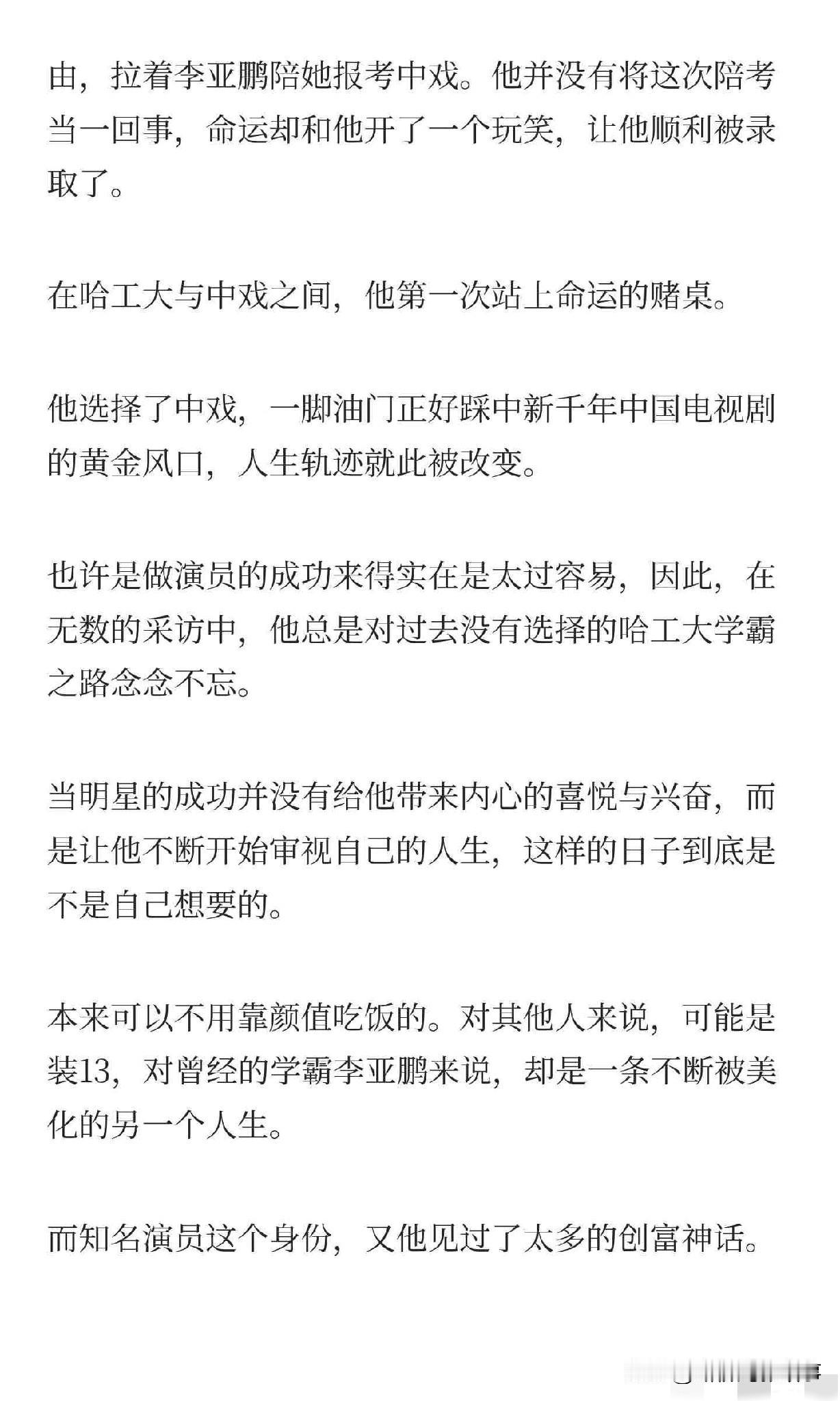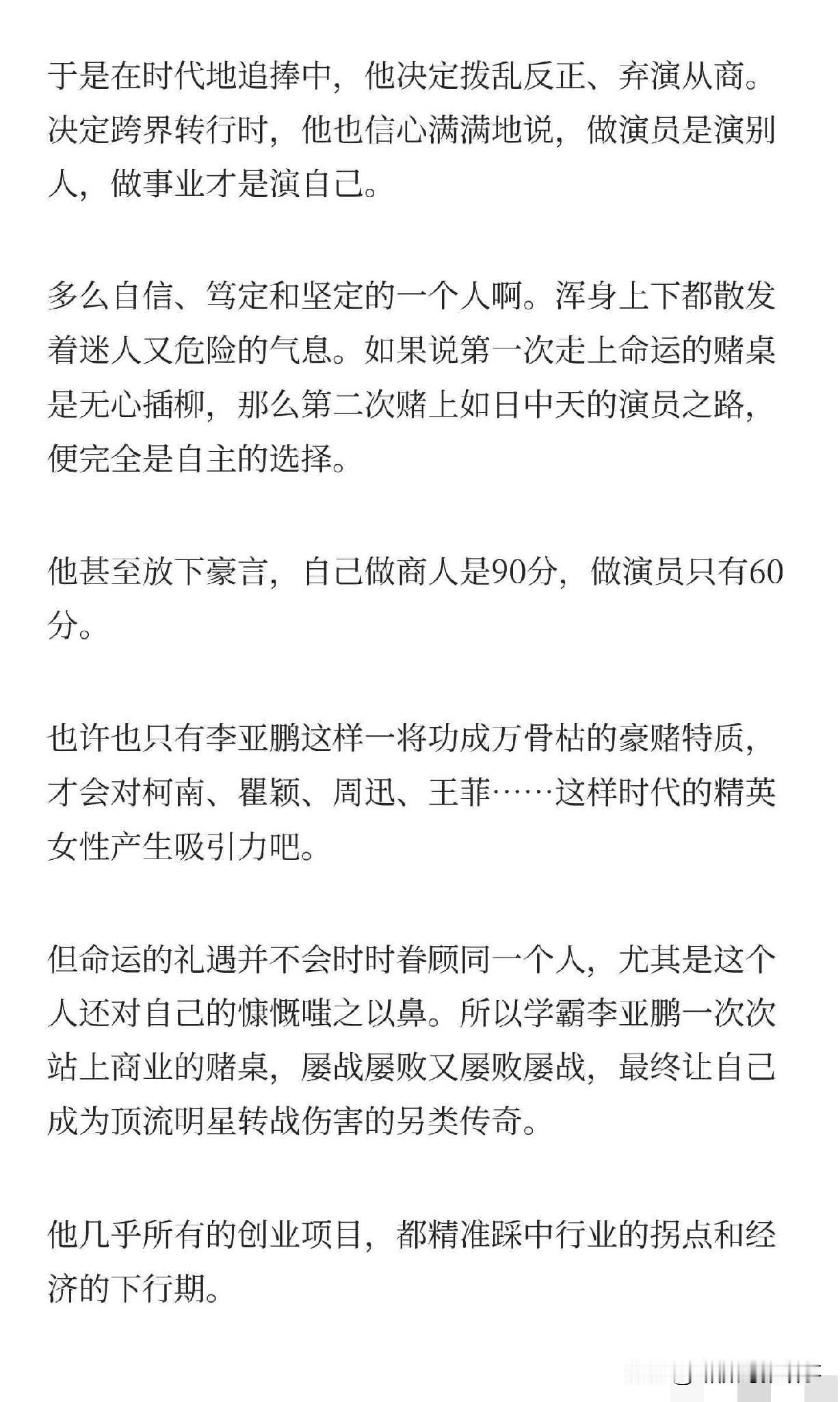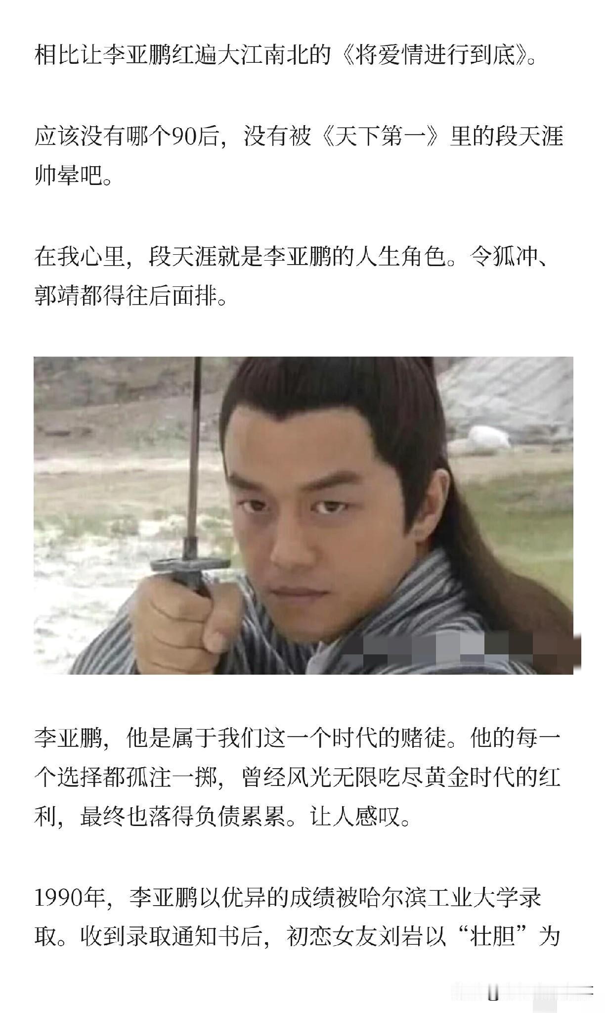 我的今日状态:😁轻松愉快 我这里的天气:☁️阴天 《李亚鹏:从“段天涯”到“时代赌徒”的人生豪赌》 他曾是《天下第一》里让90后心动的段天涯,是金庸剧里的令狐冲、郭靖,凭《将爱情进行到底》红遍大江南北——但演员的60分,始终填不满学霸李亚鹏对“另一种人生”的执念。 陪考中戏误闯演艺圈,是命运第一次把他推上赌桌;弃演从商、豪言“做商人能拿90分”,是他主动押注的第二局。可惜这一次,他踩中互联网泡沫、疫情寒冬,35亿文旅项目折戟,成了王菲口中“干啥都亏本的八爪鱼”。 从顶流演员到负债累累,他的人生像一场收不住的赌局:执念美化未选的路,偏要对抗命运的馈赠,最终在时代浪潮里,活成了“时势造英雄,也让英雄毁自己”的注脚。