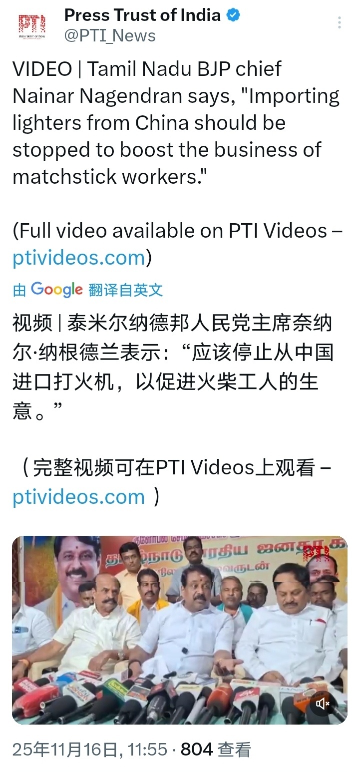 印媒:印度泰米尔纳德邦人民党主席奈纳尔 · 纳根德兰表示:"应该停止从中国进口打火机,以促进印度火柴工人的生意。"