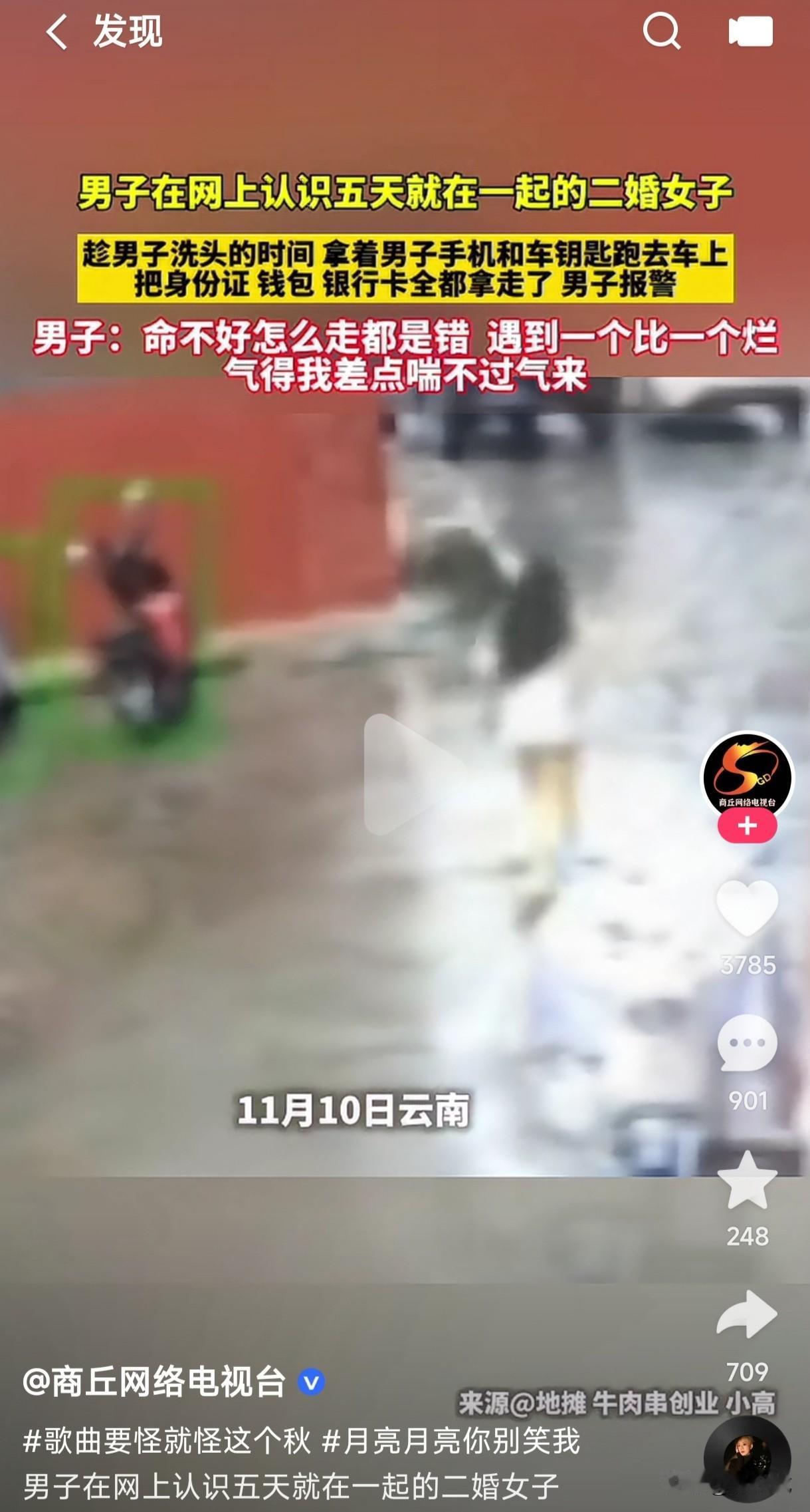 云南一男子与网上刚认识5天的二婚女子就在一起,在男子洗头的时间,女子拿着男子的手