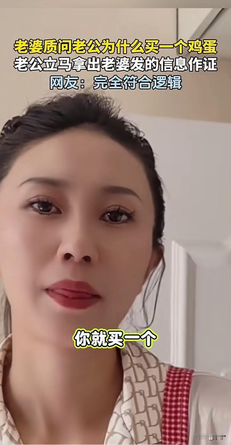 老婆质问老公为啥买一个鸡蛋, 一个鸡蛋咋吃。 老公表示你让我买一个的, 媳妇表示
