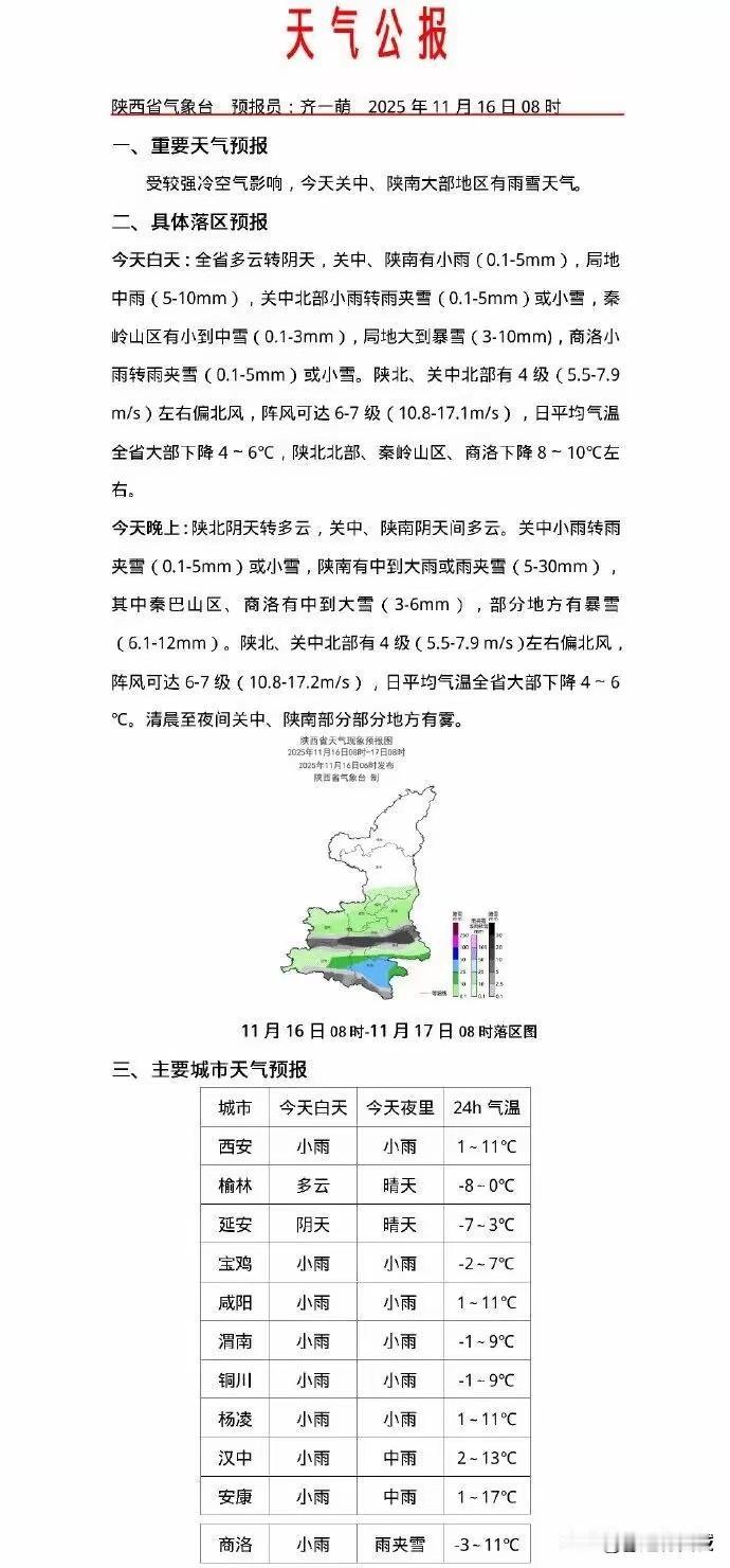 3. 陕西发布暴雪蓝色预警 西安今起迎今冬首次寒潮:2025年11月16日11时陕西发布暴雪蓝色预警,16日11时至17日11时秦巴山区等部分地区中到大雪,西安南部等局地暴雪到大暴雪,降雪时段16日夜间至17日上午;受影响区域风险高,建议备应急物资、巡检加固;西安今起迎今冬首次寒潮,有雨雪霜冻,14时起降水,20时后城区雨转雨夹雪,秦岭山区中雪局地暴雪,气温下降。稿件来自头条AⅠ订阅