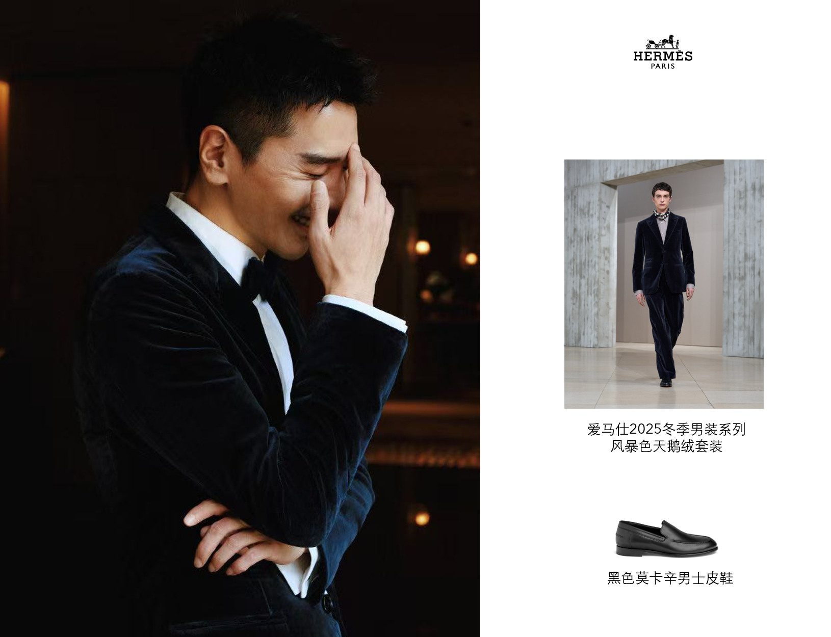 演员赵又廷身着爱马仕2025冬季男装系列风暴色天鹅绒套装搭配黑色莫卡辛男士皮鞋,出席第38届中国电影金鸡奖颁奖典礼暨2025年中国金鸡百花电影节闭幕式。好帅好帅!